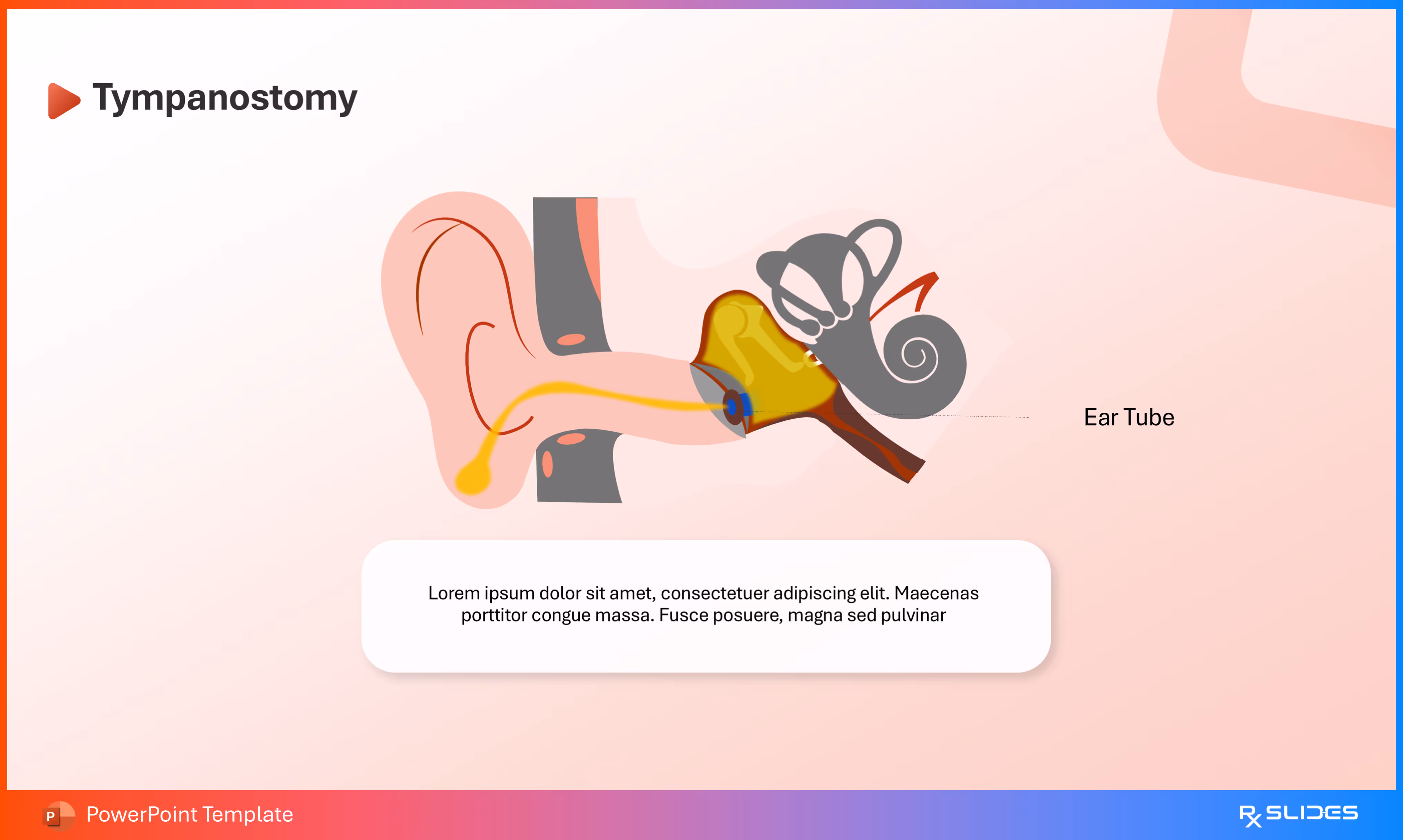 The slide features a large illustration showing the ear anatomy with a small tube inserted through the Tympanic Membrane into the middle ear space.