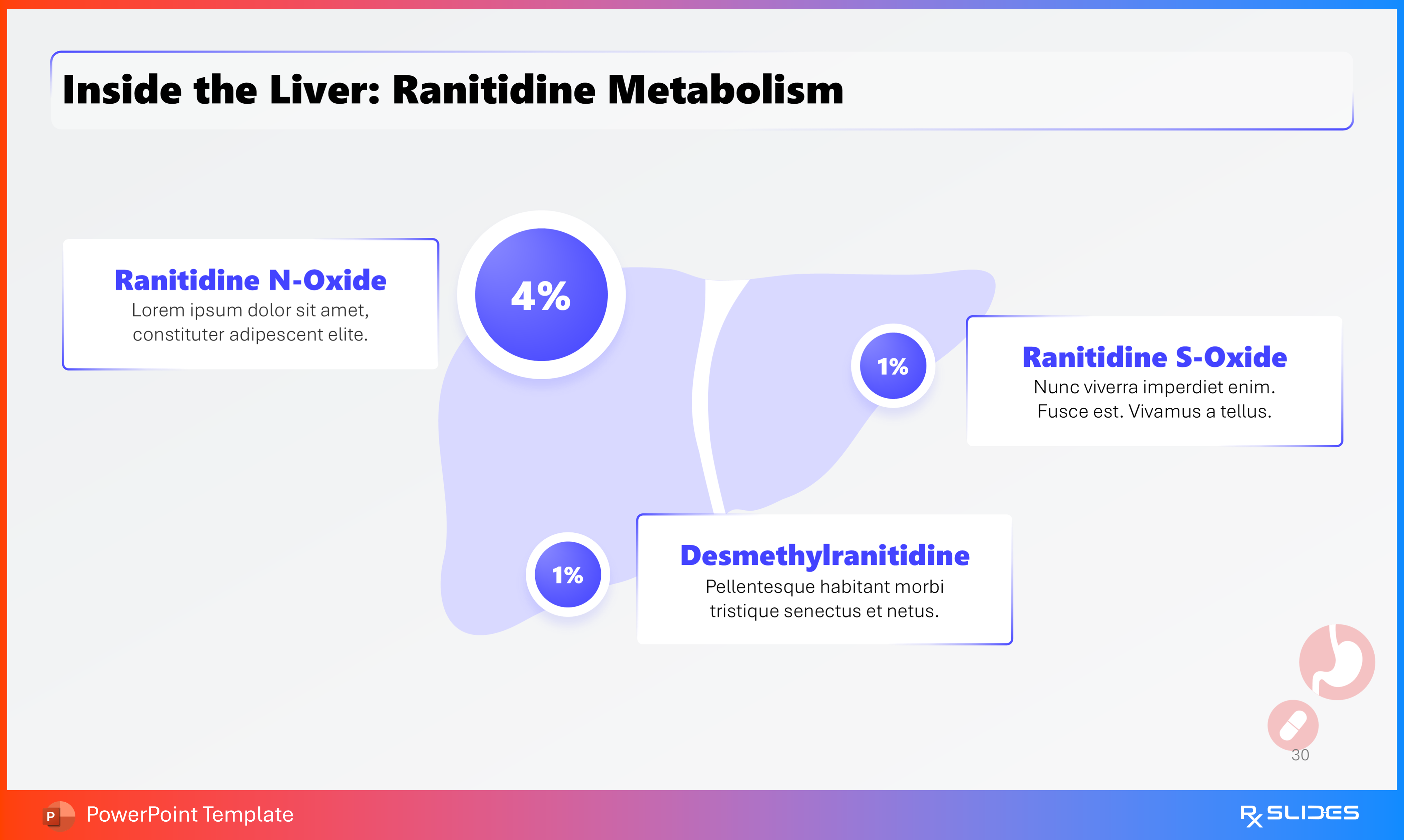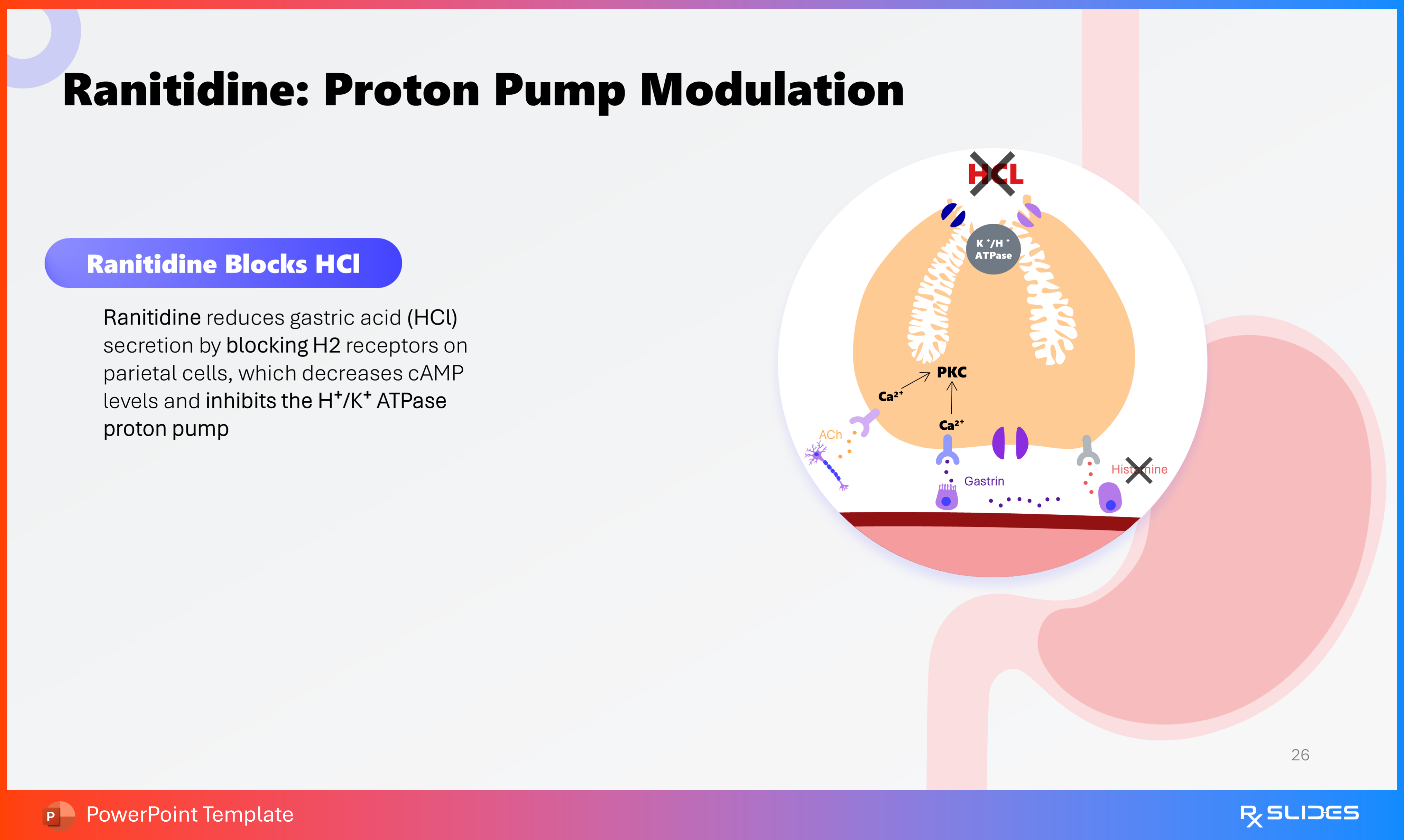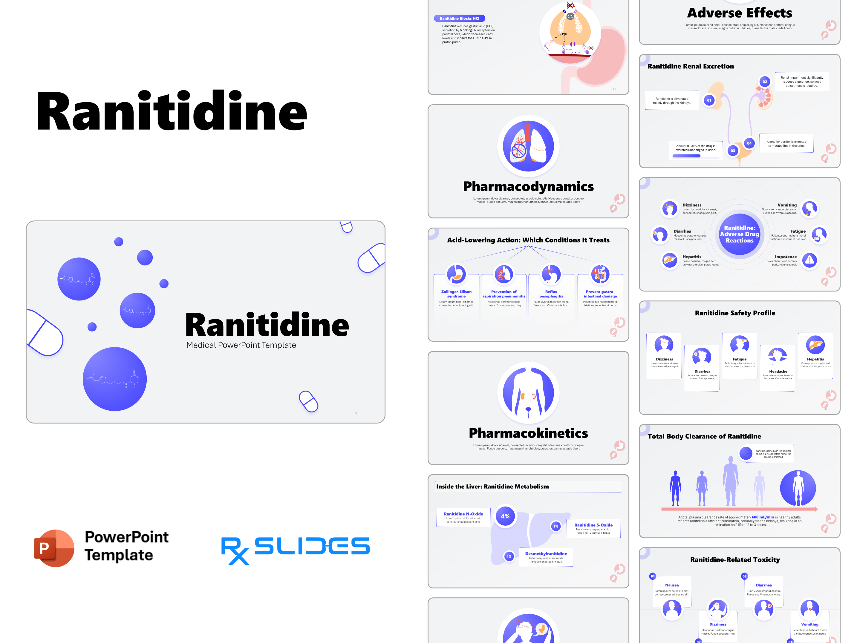 Present the complete pharmacological profile of ranitidine with this professional, medically accurate PowerPoint template. Designed for pharmacists, medical educators, and clinical presenters, this 47-slide deck offers a comprehensive visual guide to H2 blockers. From high-resolution microscopic views of the gastric mucosa to detailed diagrams of the proton pump mechanism and comparative pharmacokinetics, this template transforms complex drug data into clear, easy-to-understand visual narratives. It covers every aspect of the drug's lifecycle—from molecular structure and metabolism to clinical indications and safety profiles.