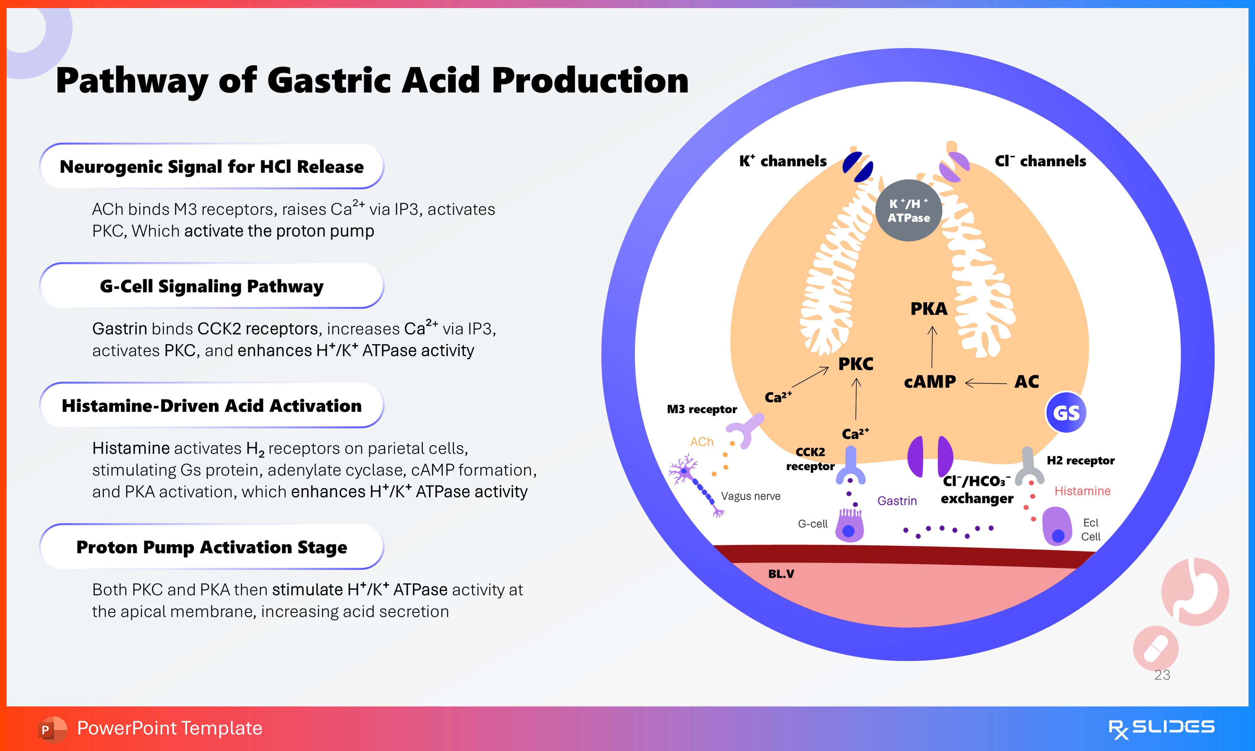 Breaks down the complex signaling pathways (neurogenic, G-cell, and histamine) that trigger the proton pump, providing deep physiological context.