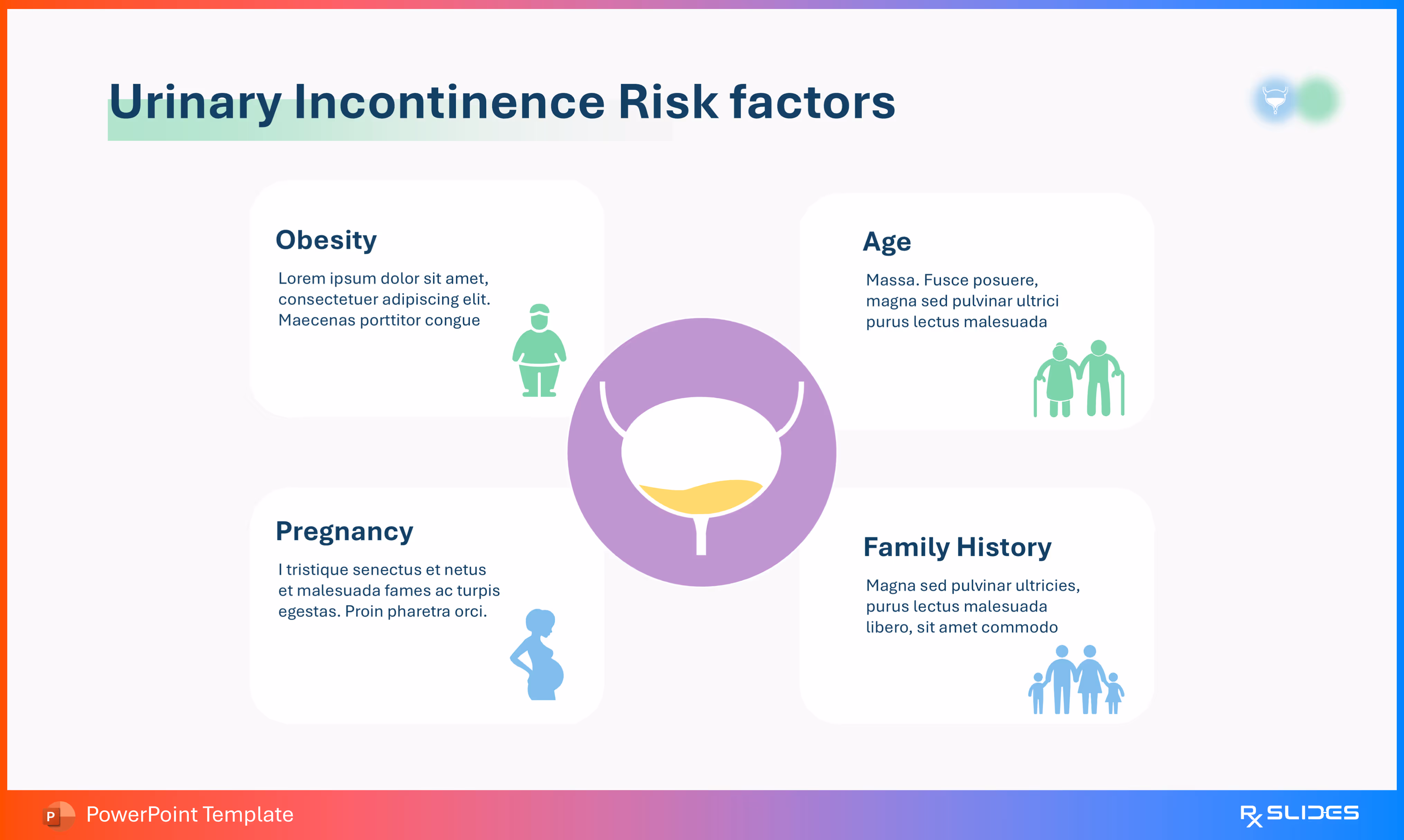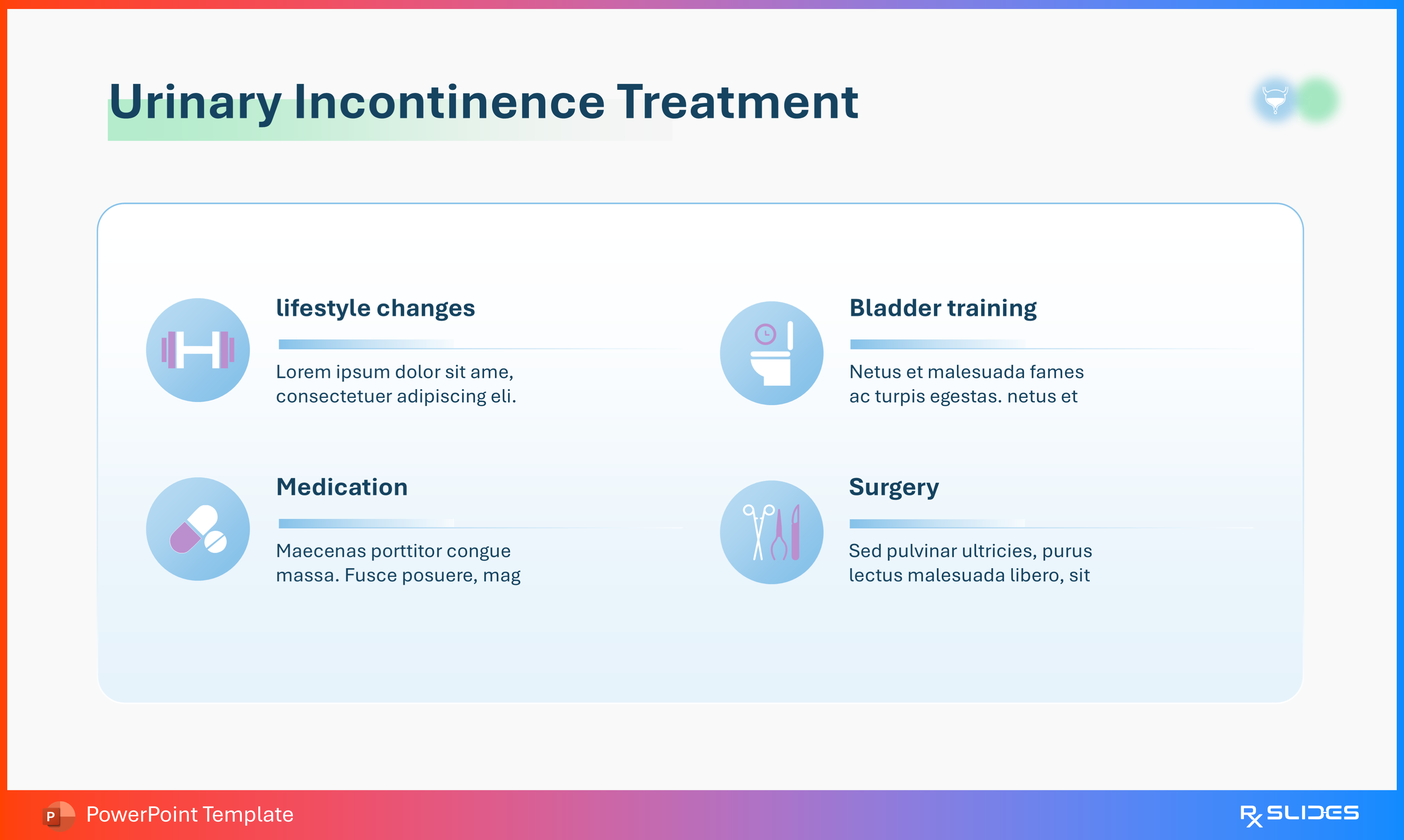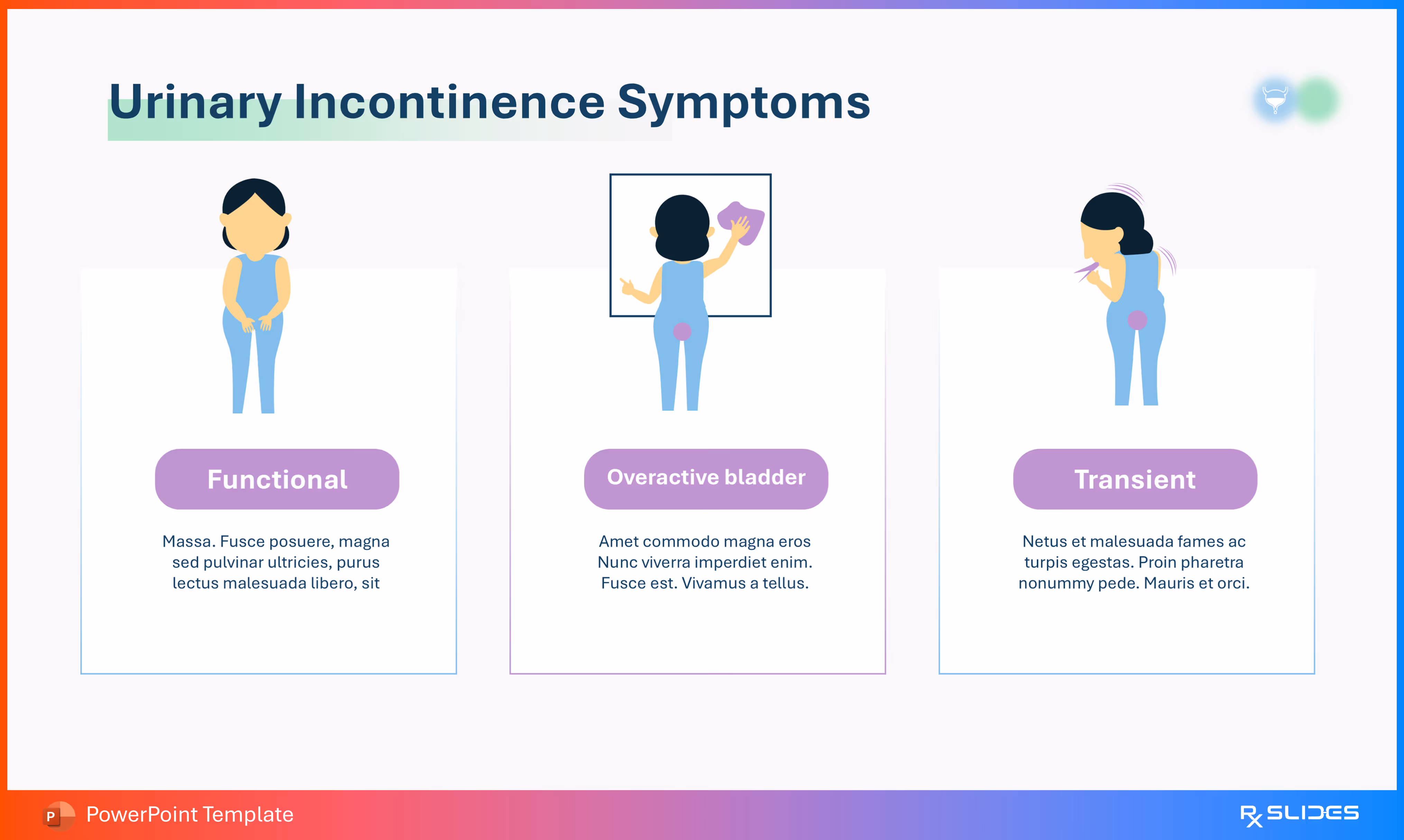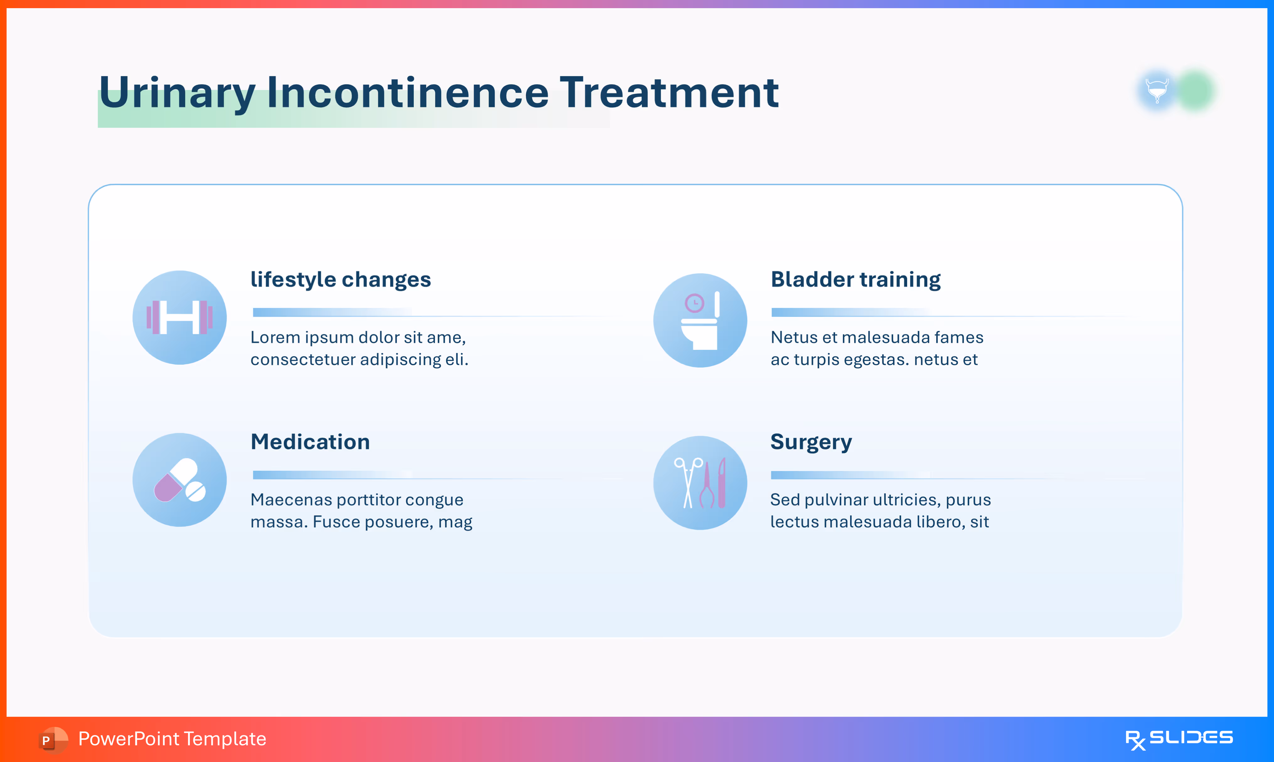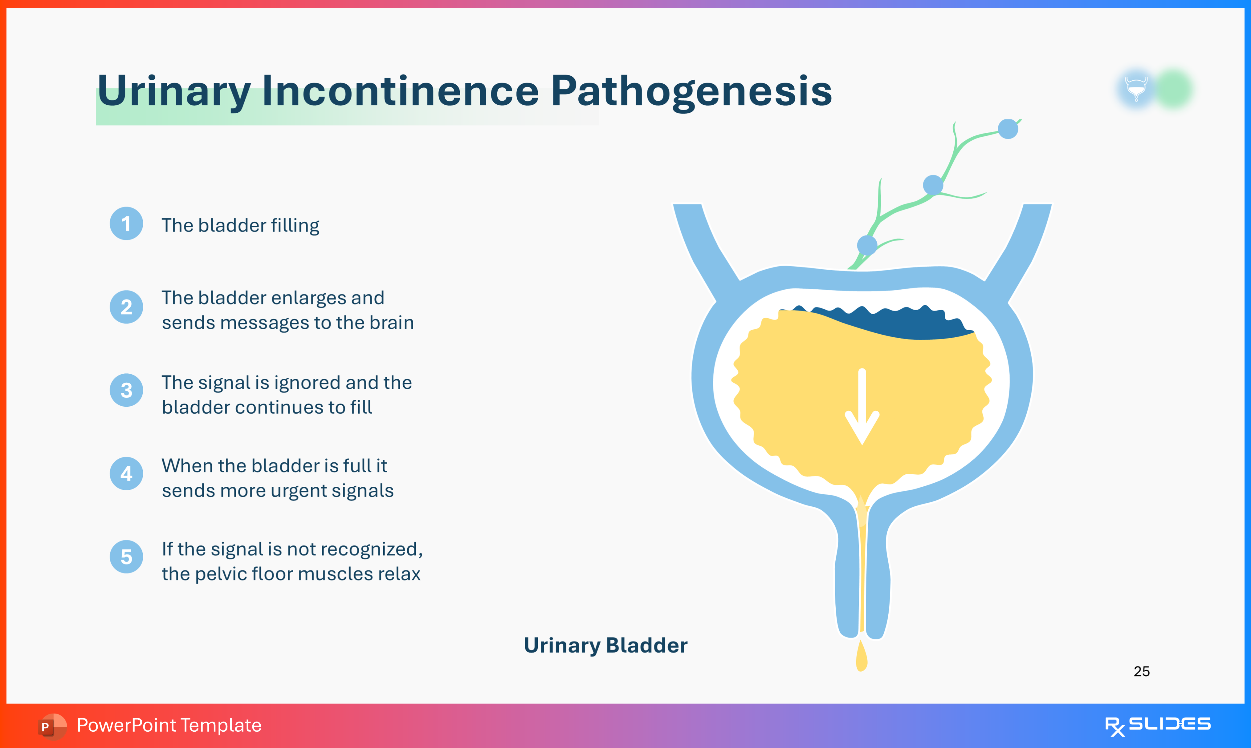 The urinary incontinence PPT is a dynamic medical PowerPoint template that can enhance the effectiveness of your presentation.