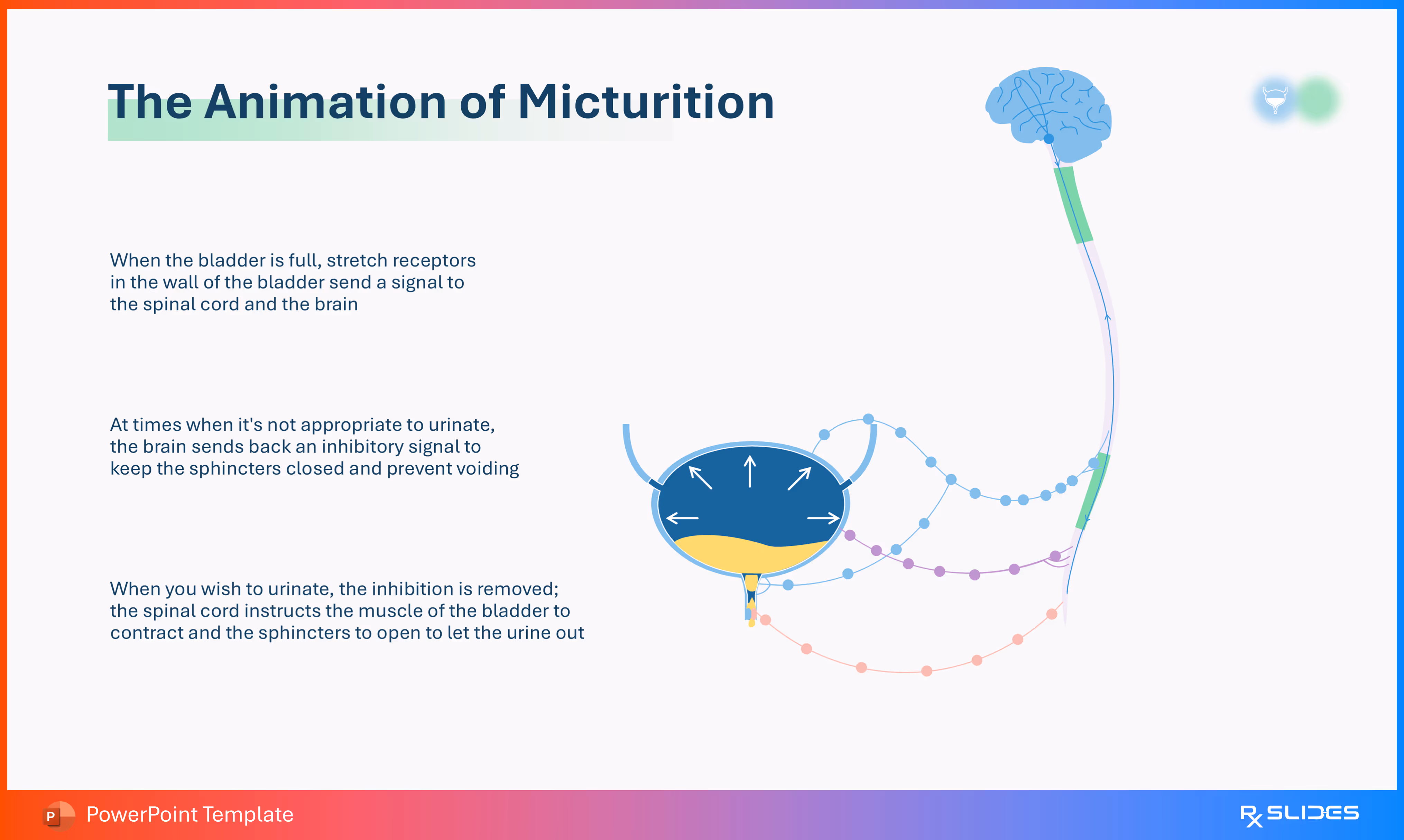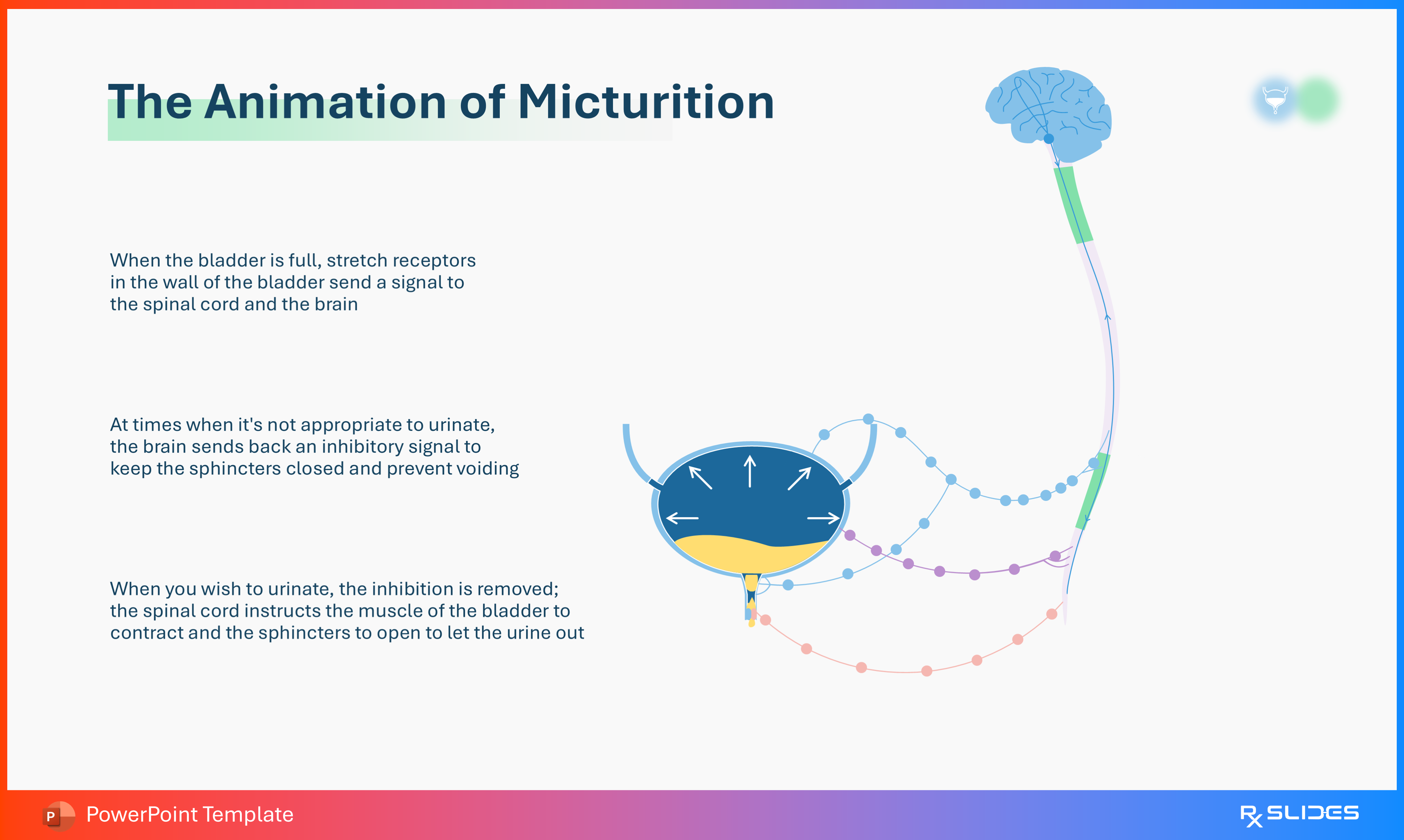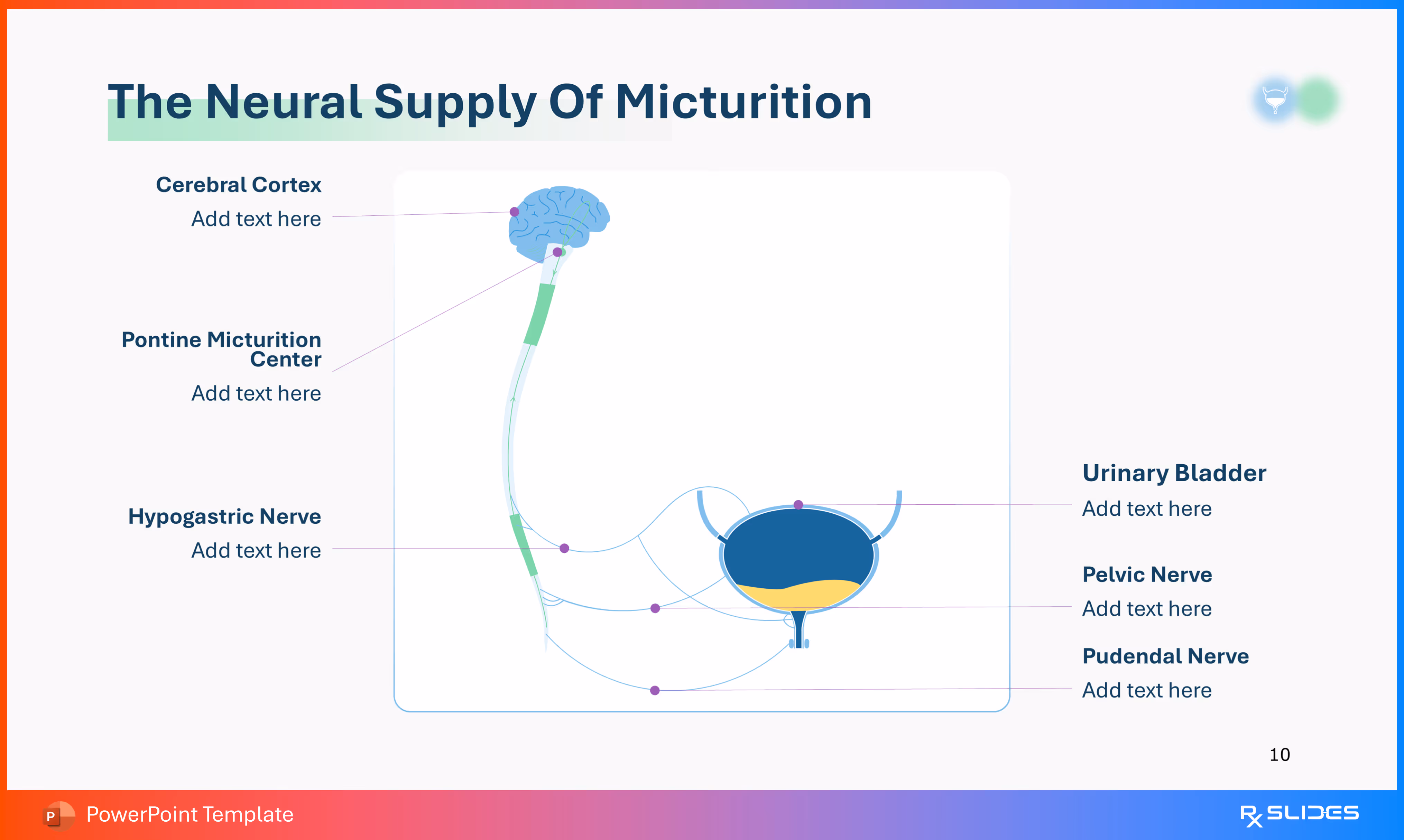 The design features a schematic diagram showing the brain centers (e.g., Cerebral Cortex, Pontine Micturition Center) and key nerves (Pelvic Nerve, Pudendal Nerve).
