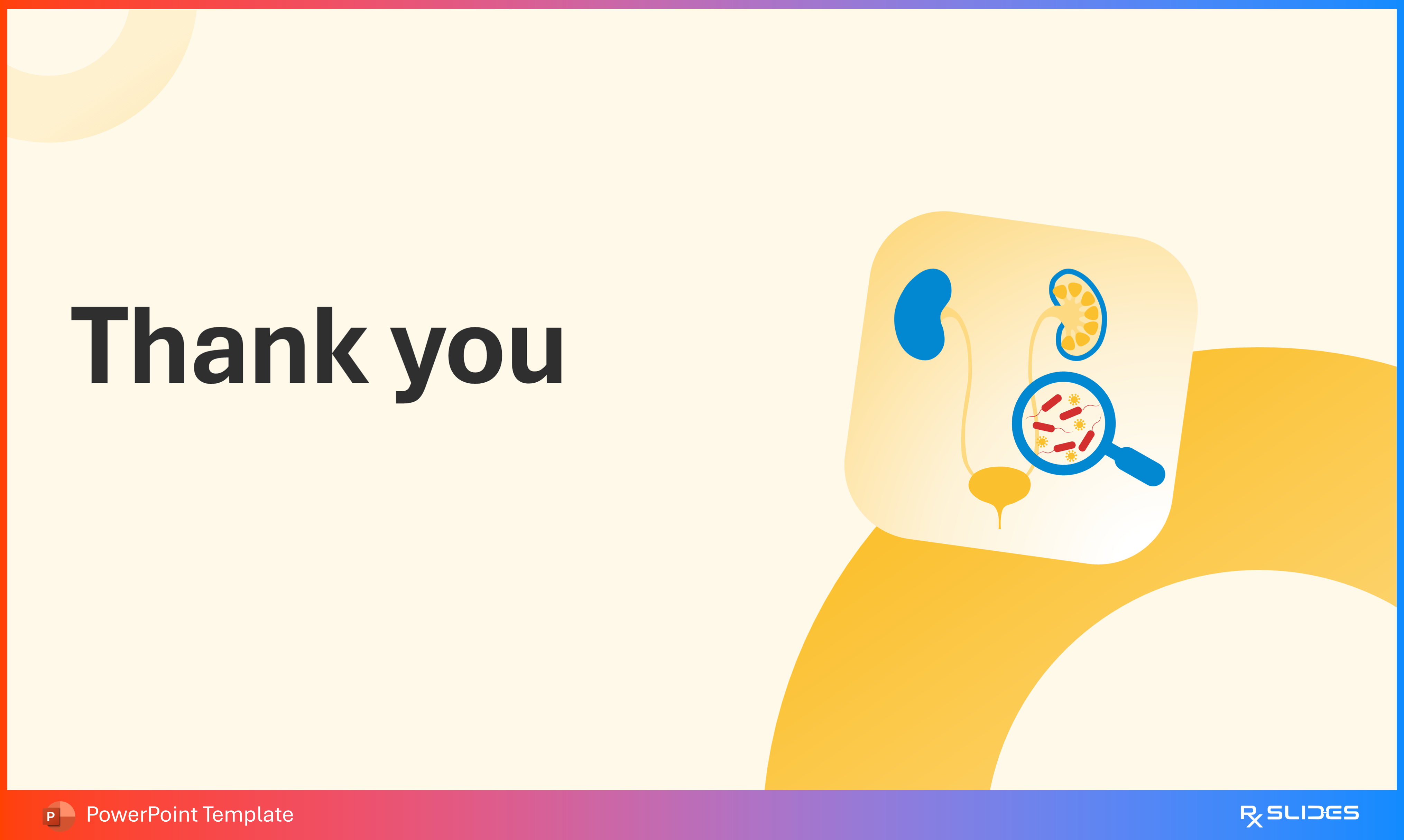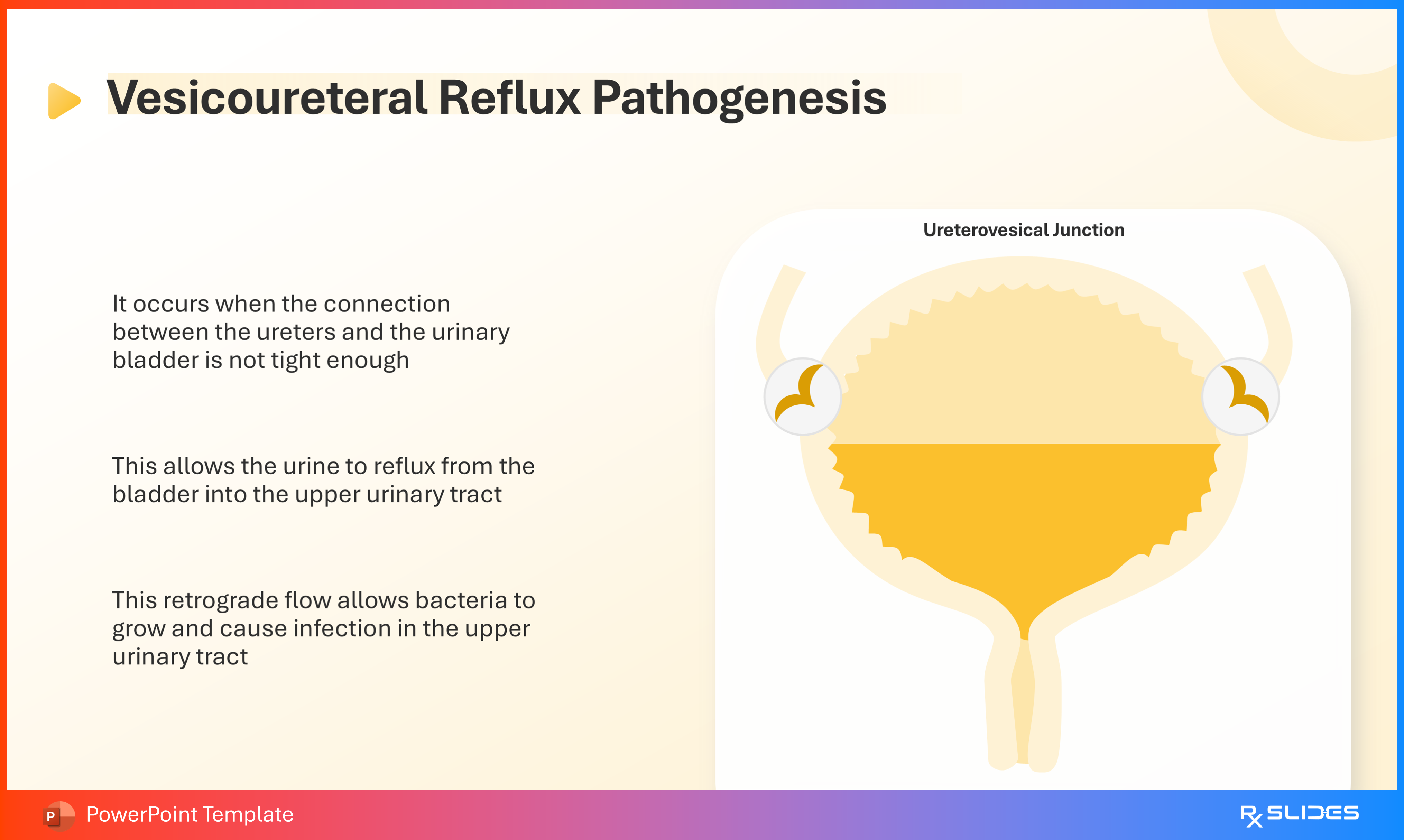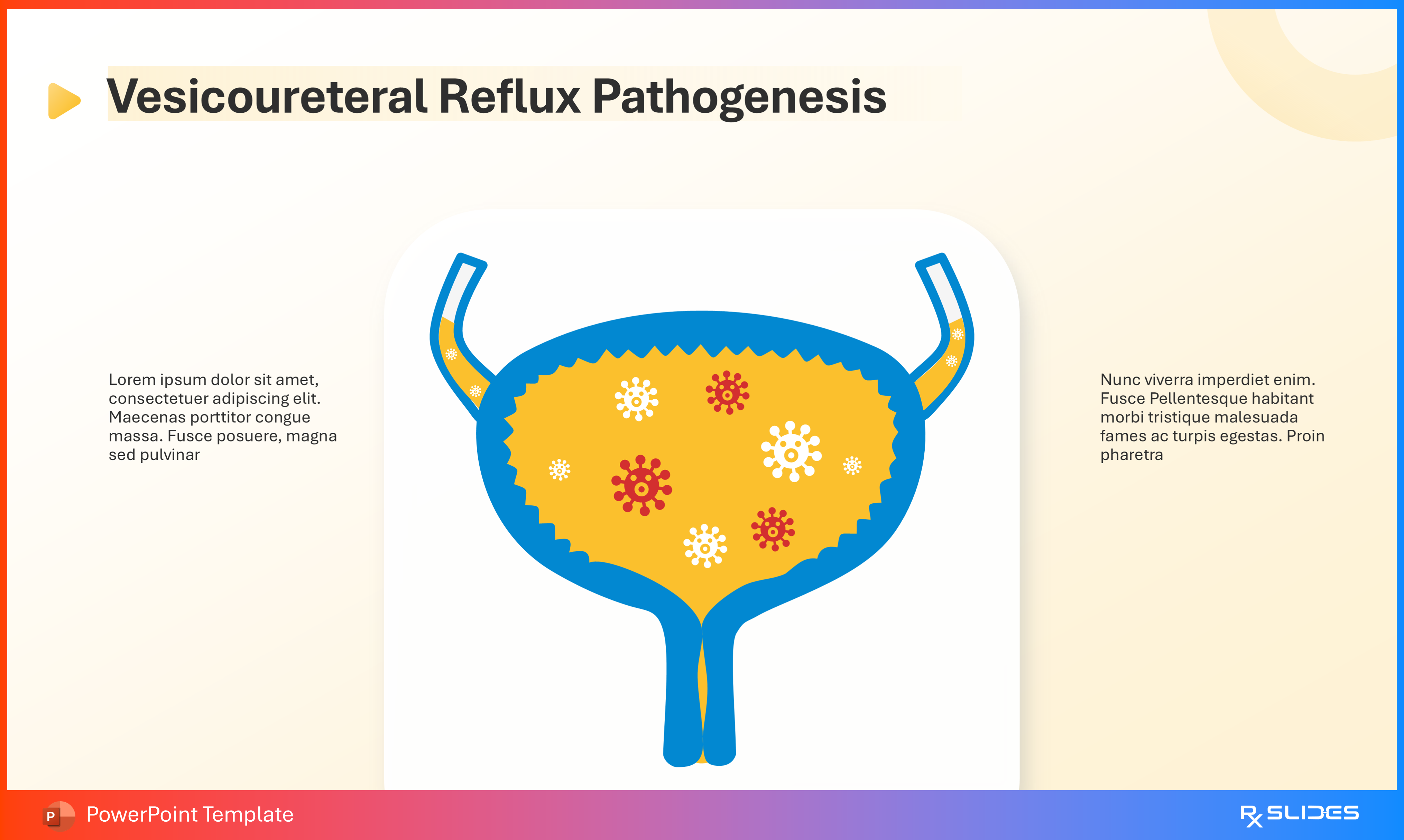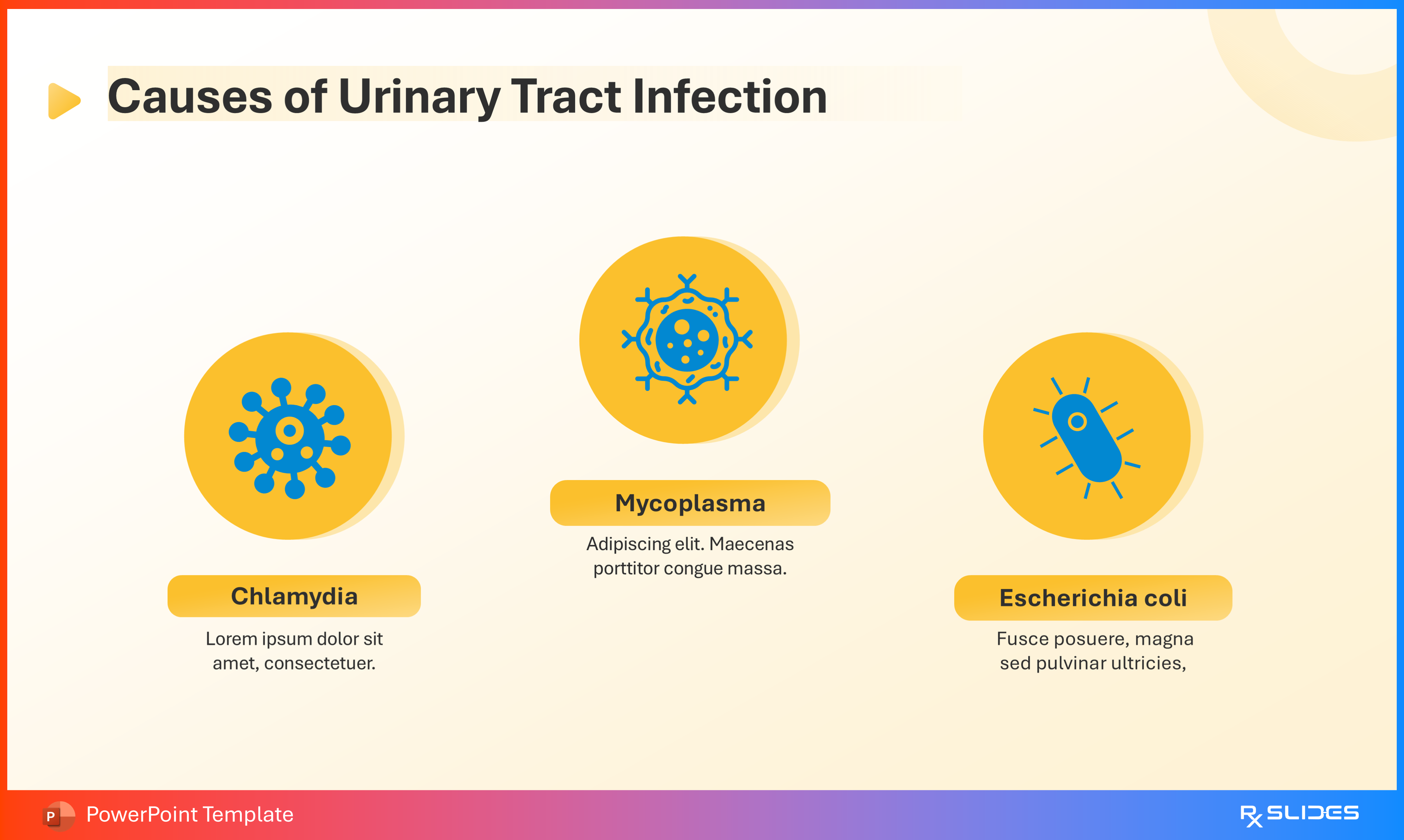 Slide 1: UTI PowerPoint Template – Intro Slide UTI PowerPoint Template – Intro Slide Clean, professional title slide introducing the Urinary Tract Infection (UTI) presentation. Medical-themed background for a strong visual impact. Slide 2: Agenda Agenda Outlines main sections of the UTI PowerPoint presentation: definition, anatomy, causes, pathogenesis, symptoms, diagnosis, treatment, and prevention. Minimalist design ensures clarity and smooth readability. Slide 3: Topics Overview Topics Overview Highlights key sections to be covered next in the UTI slides. Provides a clear roadmap for audience engagement. Slide 4: Definition Slide for UTI Definition Slide for UTI Balanced layout for concise explanation of UTI definition. Slide 5: Introduction Slide – Urinary System Infographics Introduction Slide – Urinary System Infographics Modern infographics clarify relationships and the function of urinary organs. Editable vectors allow highlighting key structures. Slide 6: Alternate Layout for Definition Alternate Layout for Definition Ideal for explaining UTI pathophysiology and gender-based differences. Slide 7: Introductory Design Variation Introductory Design Variation Concise summary of UTI disease overview. Slide 8: Urinary System Anatomy – Section Divider Urinary System Anatomy – Section Divider Transition slide featuring a stylized urinary tract illustration. Slide 9: Urinary System Anatomy Overview Urinary System Anatomy Overview Illustrates key organs: kidneys, ureters, bladder, and urethra. Supports smooth understanding of infection pathways. Slide 10: Female Urinary System Anatomy Female Urinary System Anatomy Focuses on female urinary tract structure, highlighting UTI susceptibility. Slide 11: Male Urinary System Anatomy Male Urinary System Anatomy Illustrates the male urinary tract, including the bladder, urethra, and prostate. Highlights gender-specific anatomical differences. Slide 12: Urinary Tract Infection Prevalence – Section Divider Urinary Tract Infection Prevalence – Section Divider Introduces epidemiology and prevalence data. Slide 13: Prevalence Data Visualization Prevalence Data Visualization Shows UTI incidence by age and gender. Includes icons and charts for clarity. Slide 14: Urinary Tract Infection Risk Factors – Section Divider Urinary Tract Infection Risk Factors – Section Divider Segments the risk factors contributing to UTIs. Slide 15: UTI Risk Factors UTI Risk Factors Highlights main factors: spermicides, age, enlarged prostate, poor hygiene, sexual activity, and pregnancy. Uses clean medical icons and an organized layout. Slide 16: UTI Risk Factors – Alternate Layout UTI Risk Factors – Alternate Layout Presents risk factors concisely with clean visuals. Slide 17: Animated Slide for UTI Causes Animated Slide for UTI Causes Introduces microbial and non-microbial causes of UTIs. Slide 18: Bacterial Causes Bacterial Causes Lists common pathogens: Escherichia coli , Chlamydia , and Mycoplasma . Space available for clinical notes. Slide 19: Alternate Layout for Pathogenic Causes Alternate Layout for Pathogenic Causes Reinforces UTI causes visually with flexible design. Slide 20: Urinary Tract Infection Pathogenesis – Section Header Urinary Tract Infection Pathogenesis – Section Header Introduces mechanics of infection development. Slide 21: Pathogenesis in Female Pathogenesis in Female Explains ascending infection pathway in females. Highlights female anatomy and susceptibility with clear visuals. Slide 22: Pathogenesis in Male Pathogenesis in Male Shows UTI development in males, emphasizing anatomical differences. Slide 23: Pathogenesis—Female vs. Male Comparison Pathogenesis—Female vs. Male Comparison Side-by-side visual comparison of UTI mechanisms in both genders. Slide 24: Vesicoureteral Reflux Pathogenesis Vesicoureteral Reflux Pathogenesis Illustrates backward urine flow due to ureterovesical junction issues. Clear diagrams make kidney infection risk easy to understand. Slide 25: Vesicoureteral Reflux – Alternate Layout Vesicoureteral Reflux – Alternate Layout Visual variation emphasizing the reflux mechanism. Slide 26: Vesicoureteral Reflux – Animated Pathogenesis Vesicoureteral Reflux – Animated Pathogenesis Demonstrates retrograde urine flow and infection spread clearly. Slide 27: Vesicoureteral Reflux – Pathogenesis Vesicoureteral Reflux – Pathogenesis Second perspective highlighting retrograde urine flow and infection spread. Slide 28: Urinary Tract Infection Classifications – Section Divider Urinary Tract Infection Classifications – Section Divider Transition to classification of UTIs. Slide 39: Classifications Overview Classifications Overview Main UTI types overview: urethritis, cystitis, and pyelonephritis. Slide 30: Types of Urinary Tract Infection – Section Divider Types of Urinary Tract Infection – Section Divider Signals detailed breakdown of UTI types. Slide 31: Types Overview for UTI Types Overview for UTI Differentiates upper and lower UTIs clearly. Slide 32: Urinary Tract Infection Symptoms – Section Divider Urinary Tract Infection Symptoms – Section Divider Introduces clinical manifestations. Slide 33: Kidney Infection Symptoms Kidney Infection Symptoms Upper UTI symptoms: fever, flank pain, nausea, malaise. Slide 34: Bladder Infection Symptoms Bladder Infection Symptoms Lower UTI symptoms: burning urination, urgency, frequency, and suprapubic discomfort. Slide 35: Urethral Infection Symptoms Urethral Infection Symptoms Urethritis symptoms: painful urination, irritation, and discharge. Slide 36: Kidney Infection Symptoms – Alternate Layout Kidney Infection Symptoms – Alternate Layout Flexible presentation of upper UTI signs. Slide 37: Bladder Infection Symptoms – Alternate Layout Bladder Infection Symptoms – Alternate Layout Alternate presentation for cystitis symptoms. Slide 38: Urethral Infection Symptoms – Alternate Layout Urethral Infection Symptoms – Alternate Layout Sec