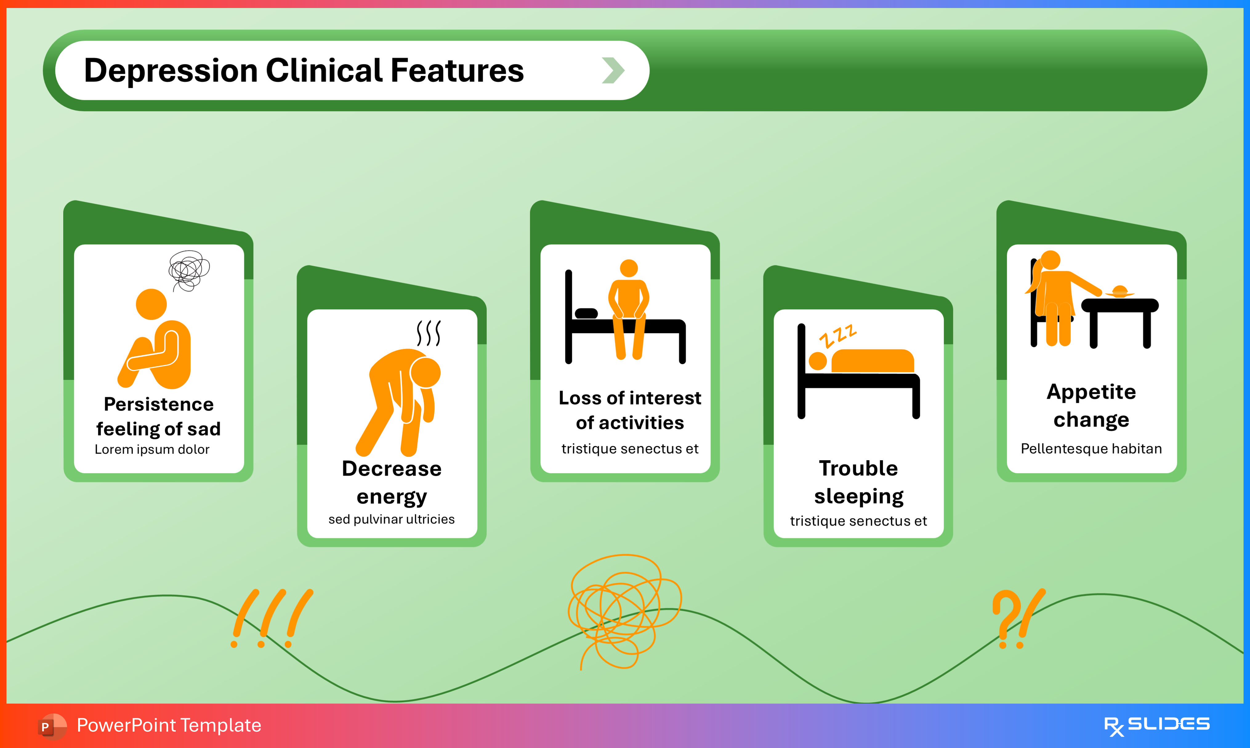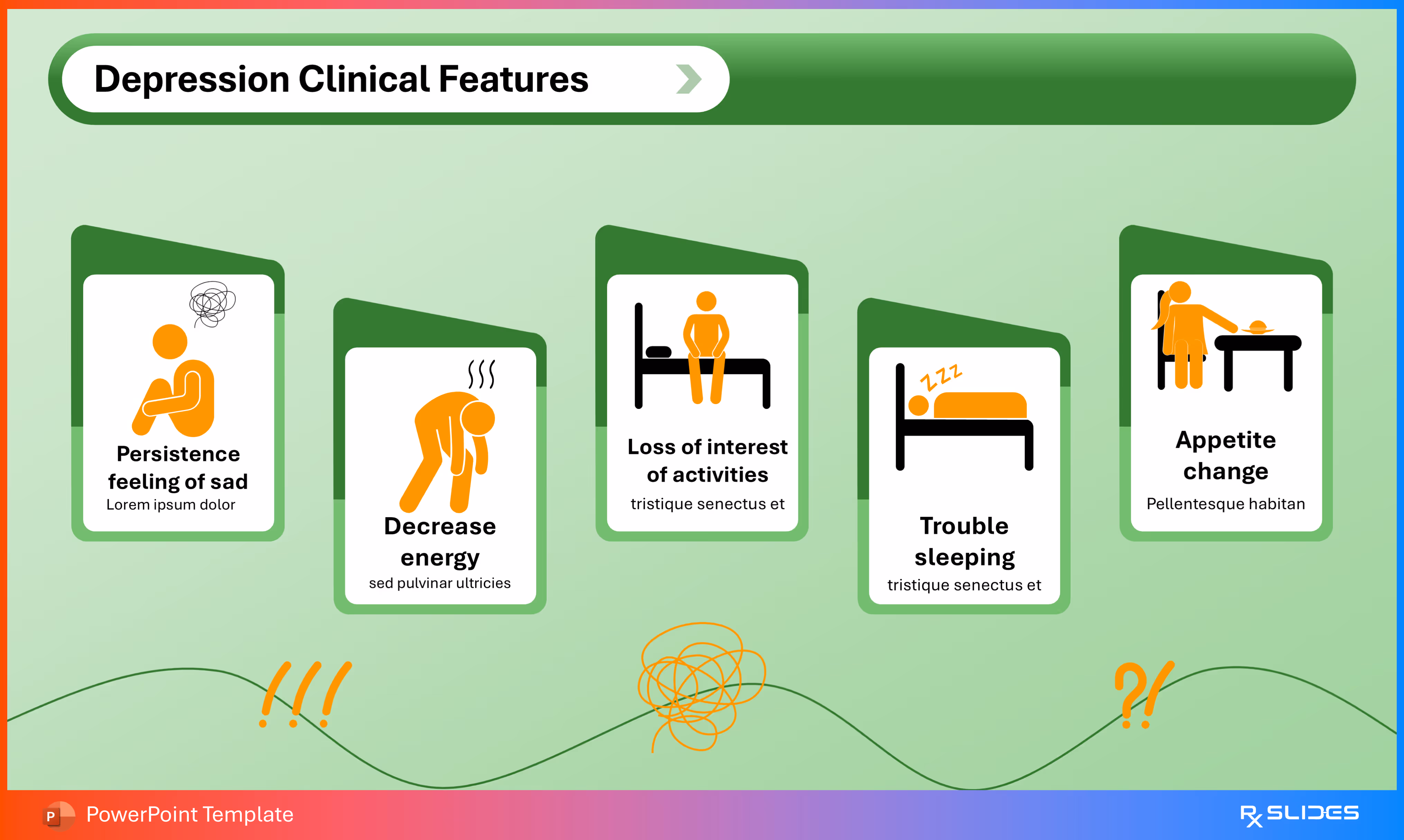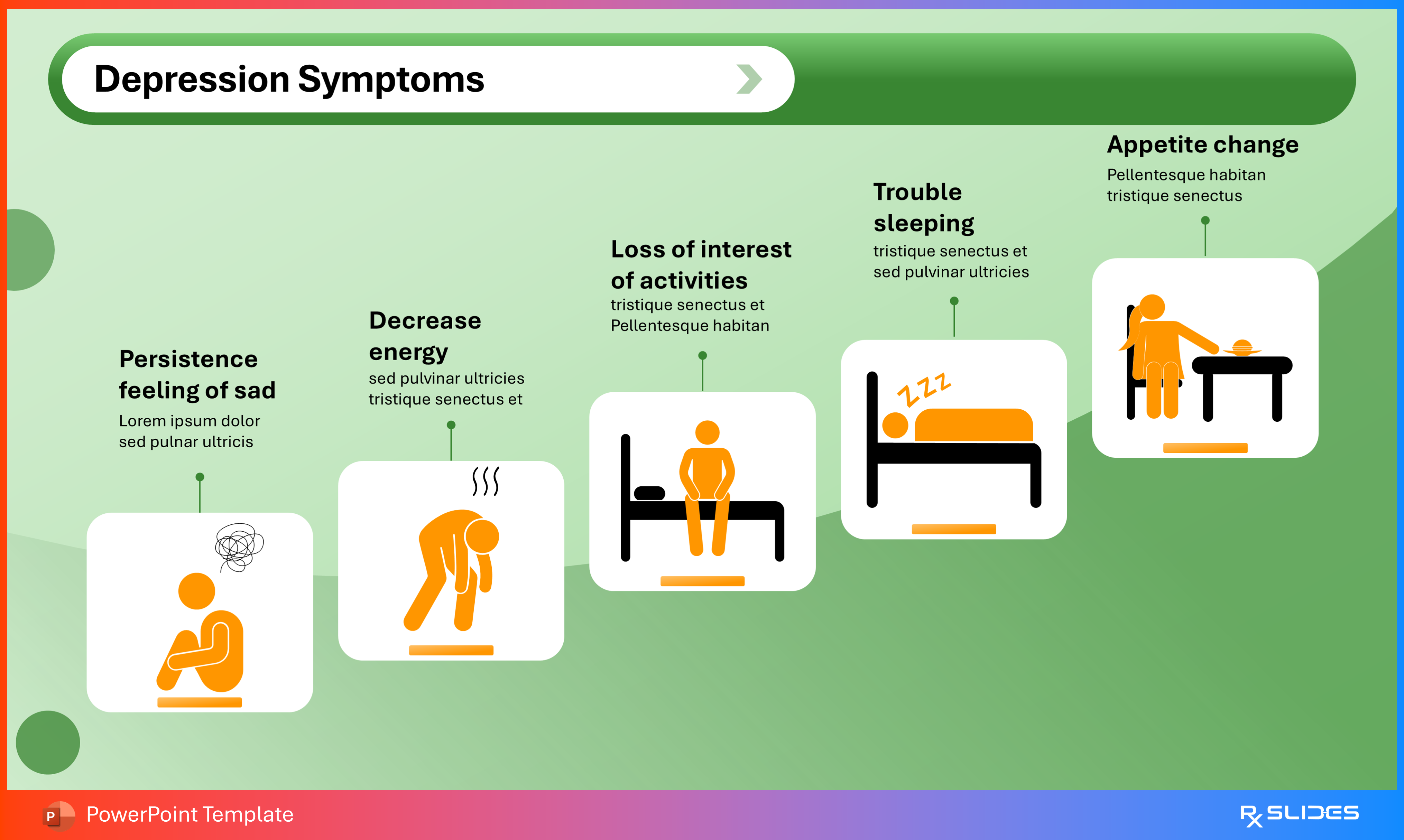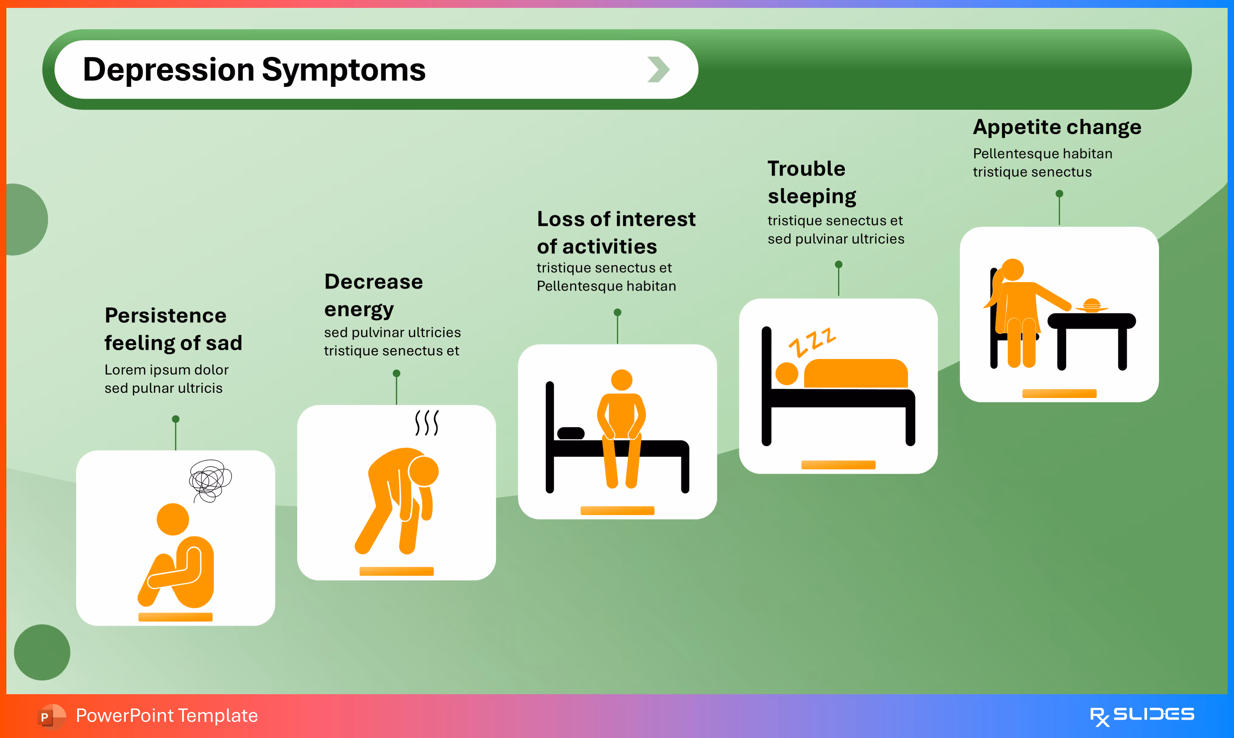 The design uses simple placeholder text with colored bullet points (green and orange) next to a strong illustration of a person experiencing distress, clearly communicating emotional symptoms.