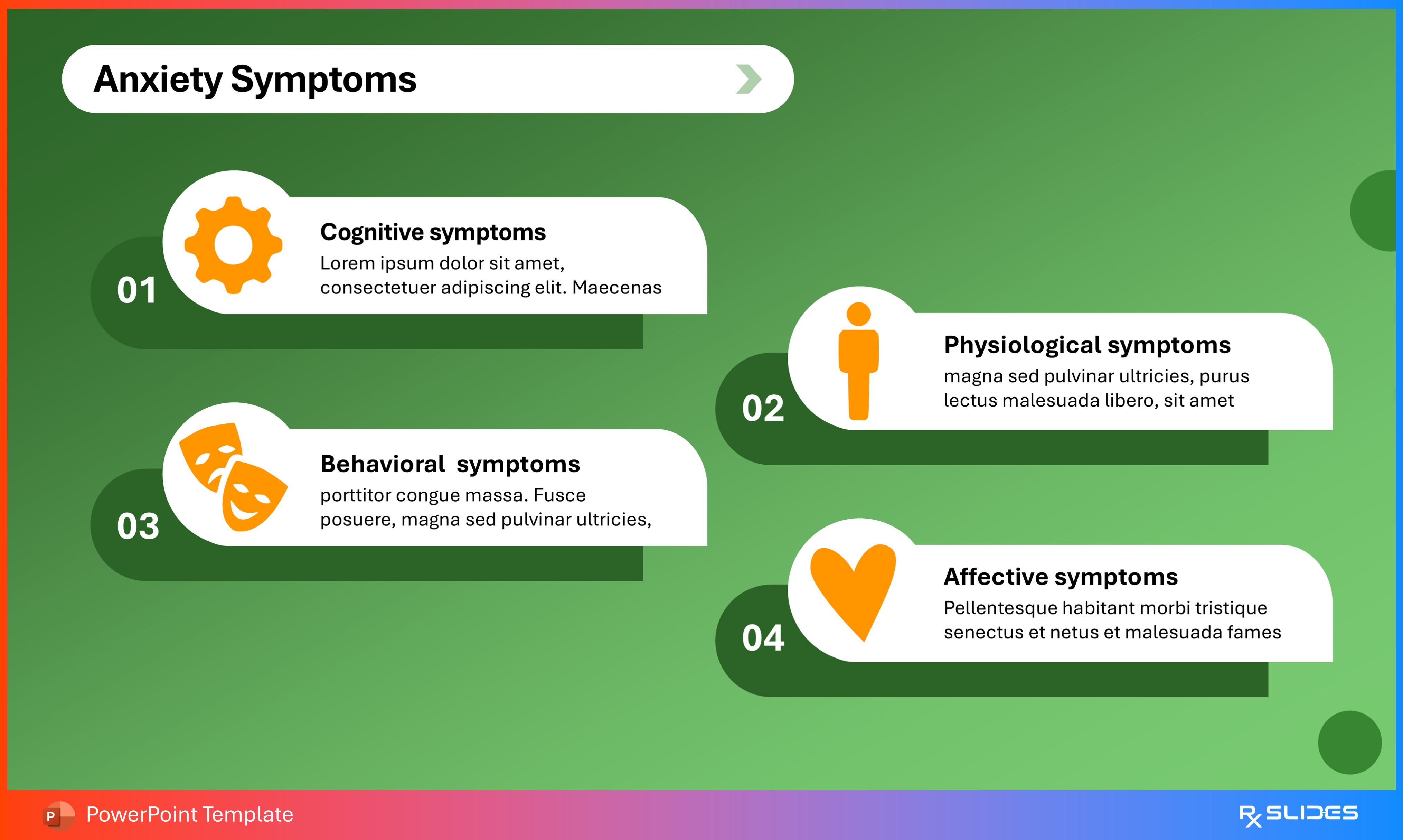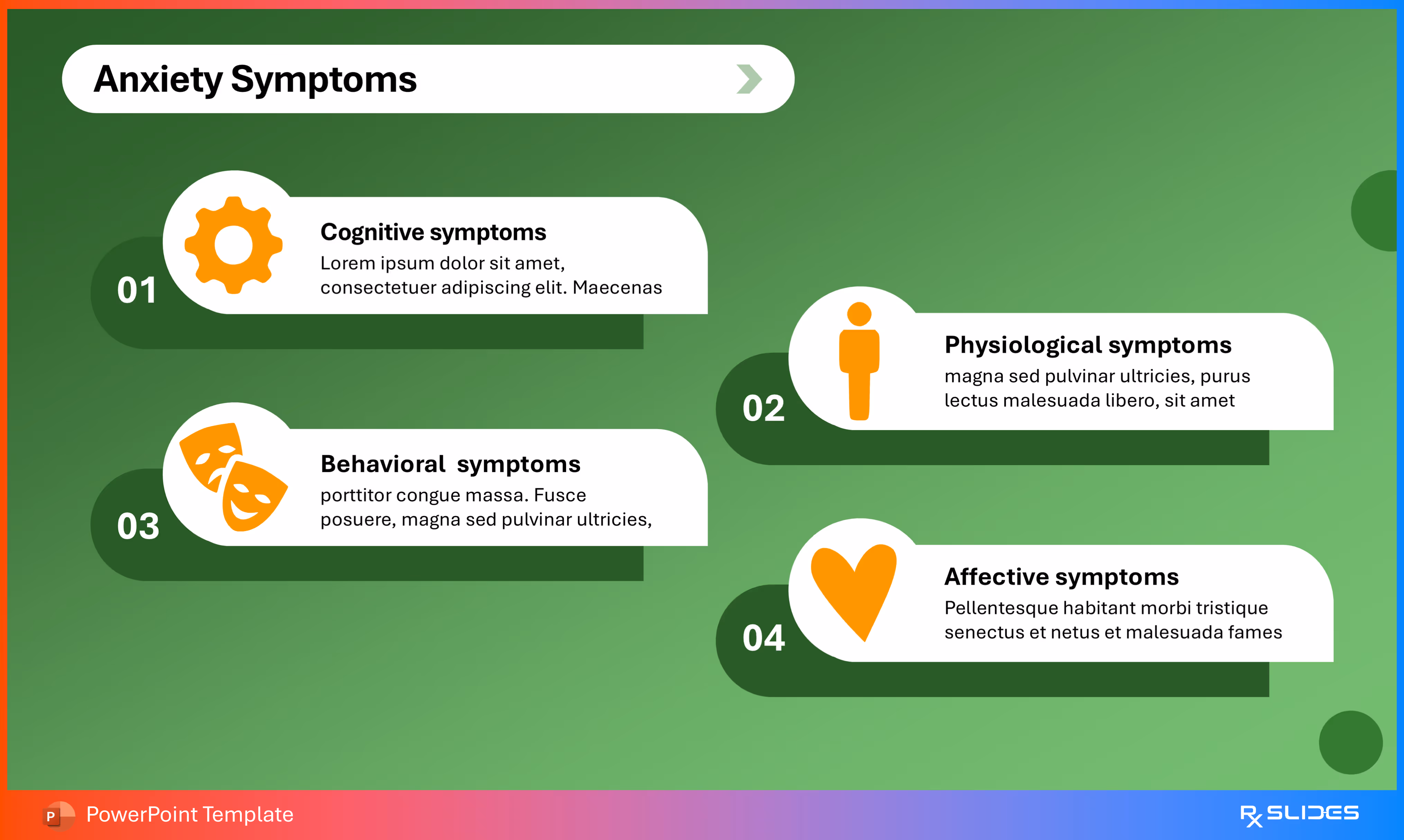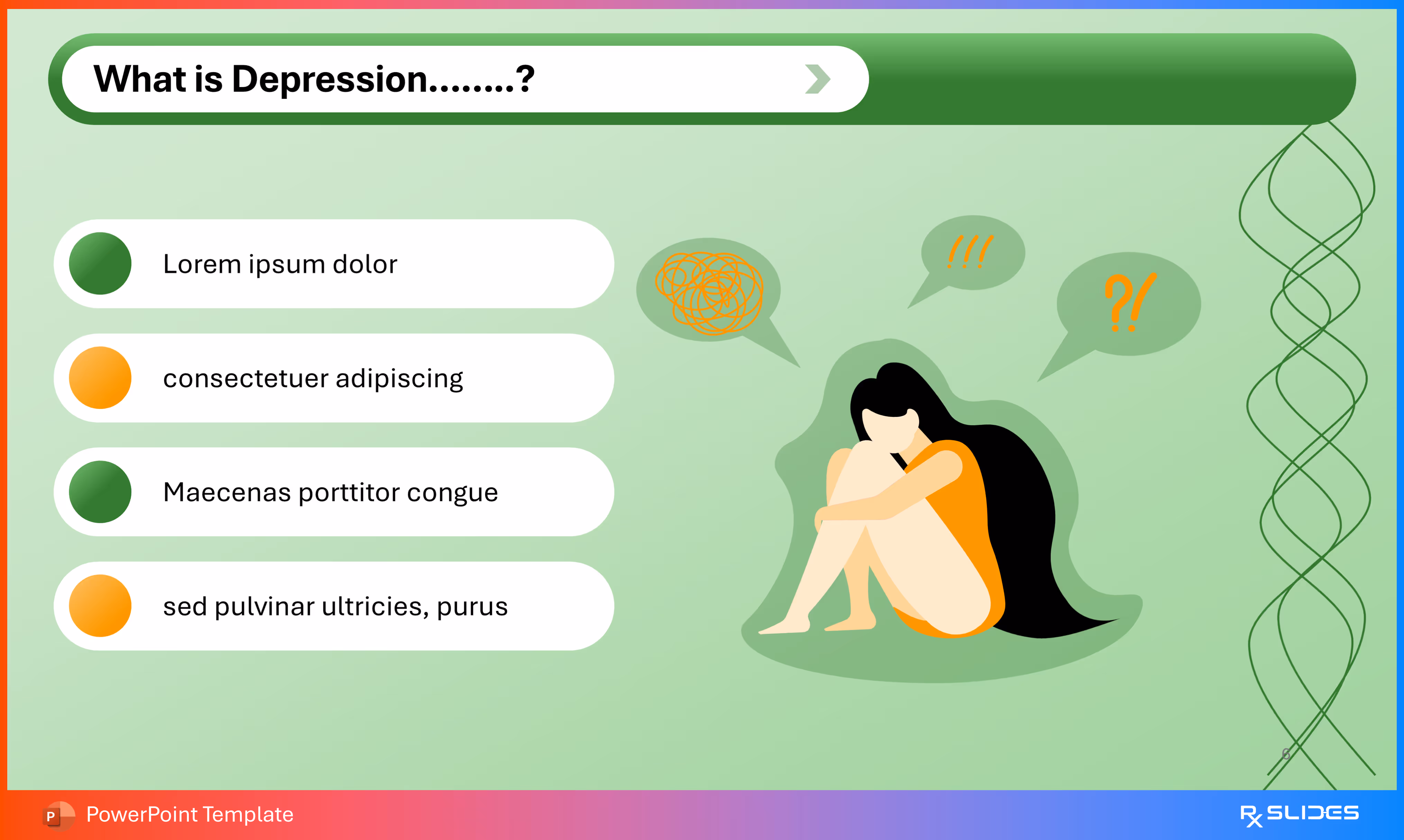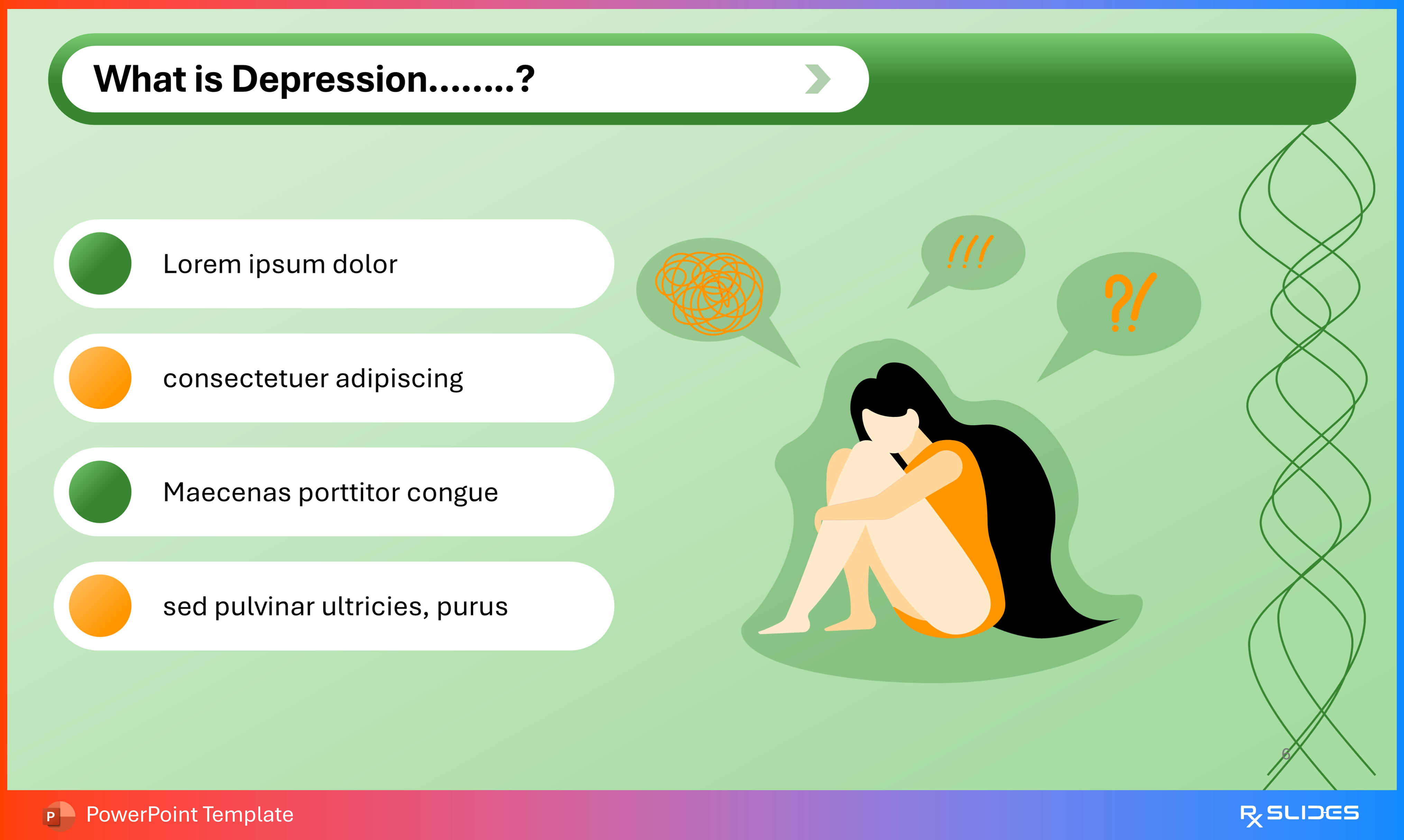 The design uses simple placeholder text with colored bullet points (green and orange) next to a strong illustration of a person experiencing distress, clearly communicating emotional symptoms.