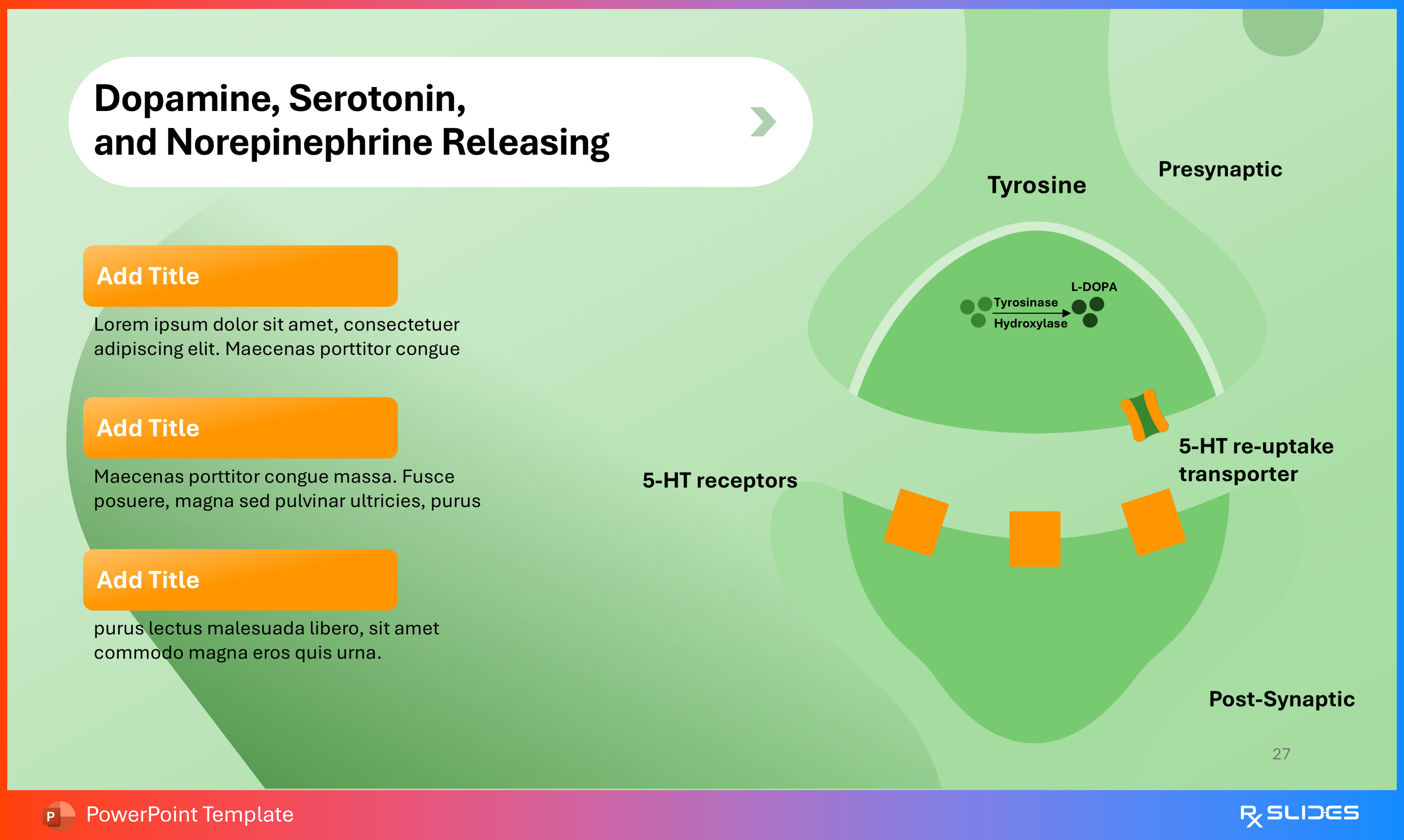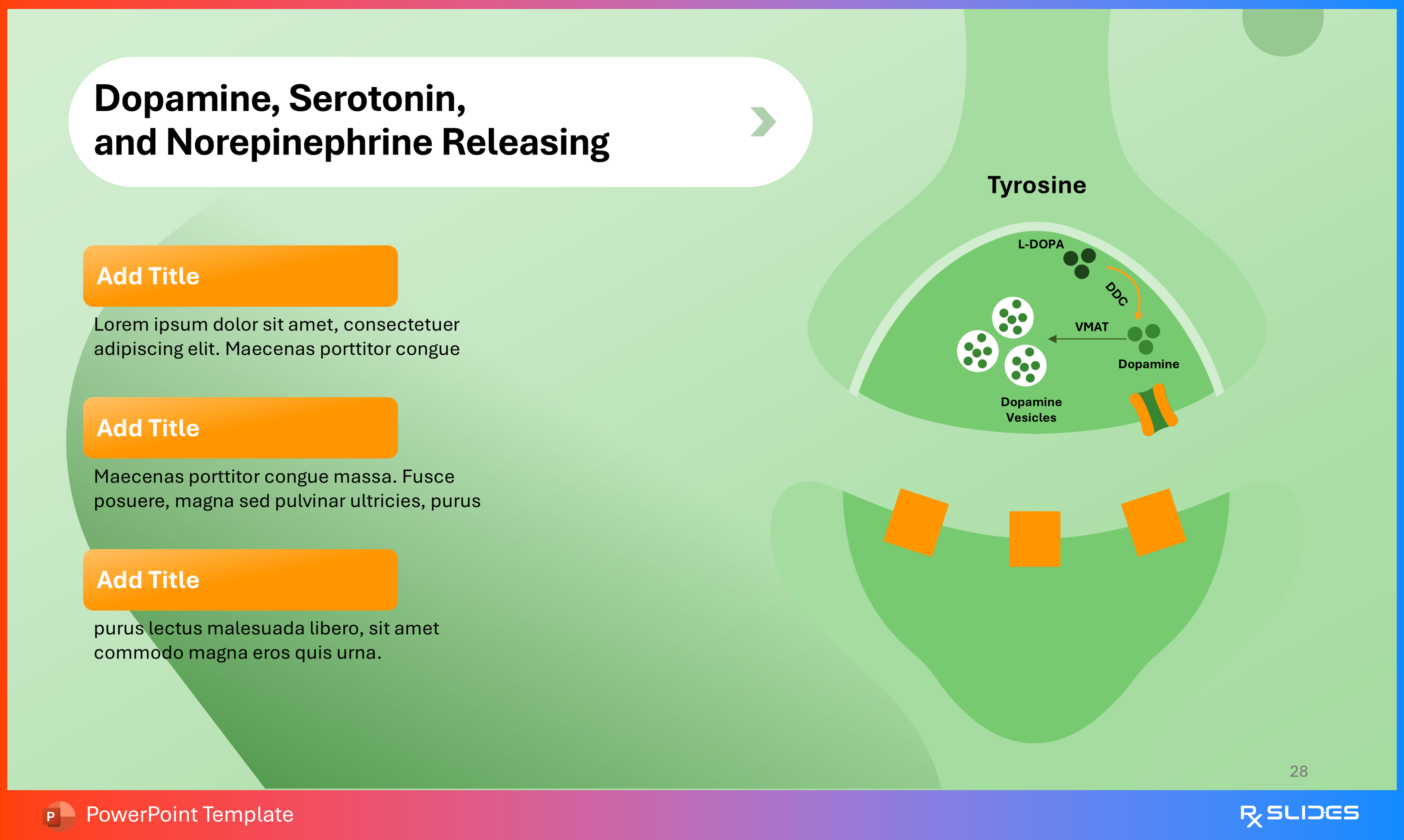 This specialized slide to clearly detail the release mechanism of key neurotransmitters like Dopamine, Serotonin, and Norepinephrine to your audience.