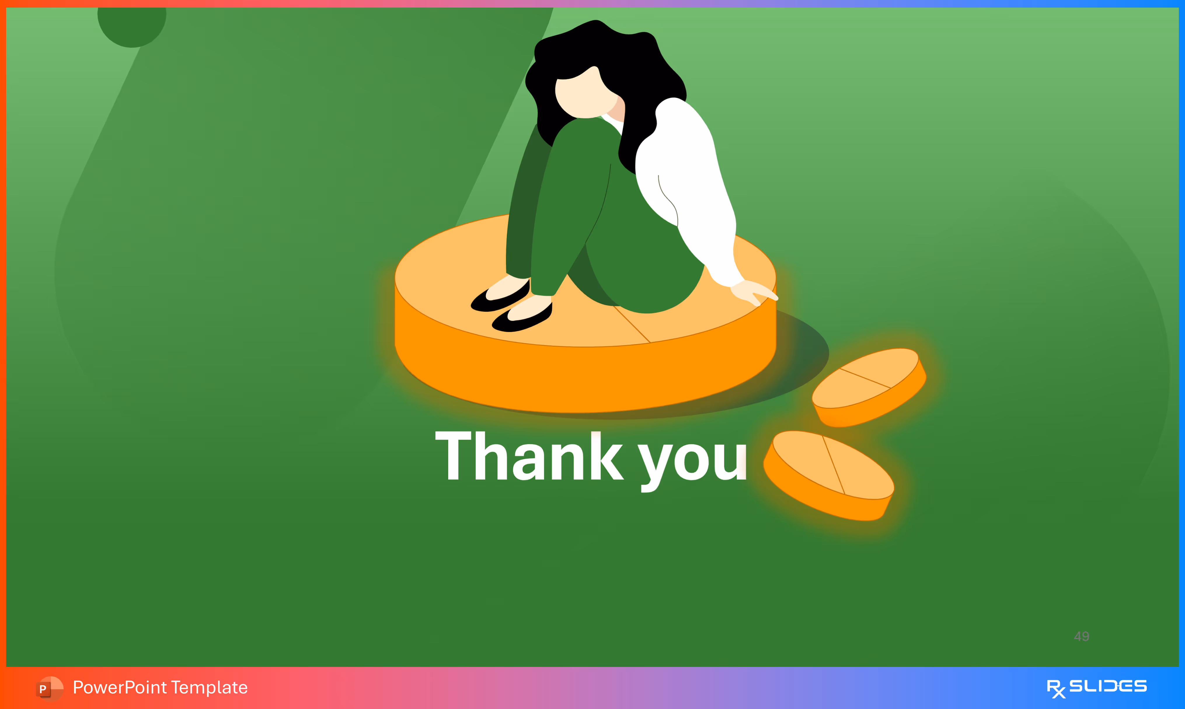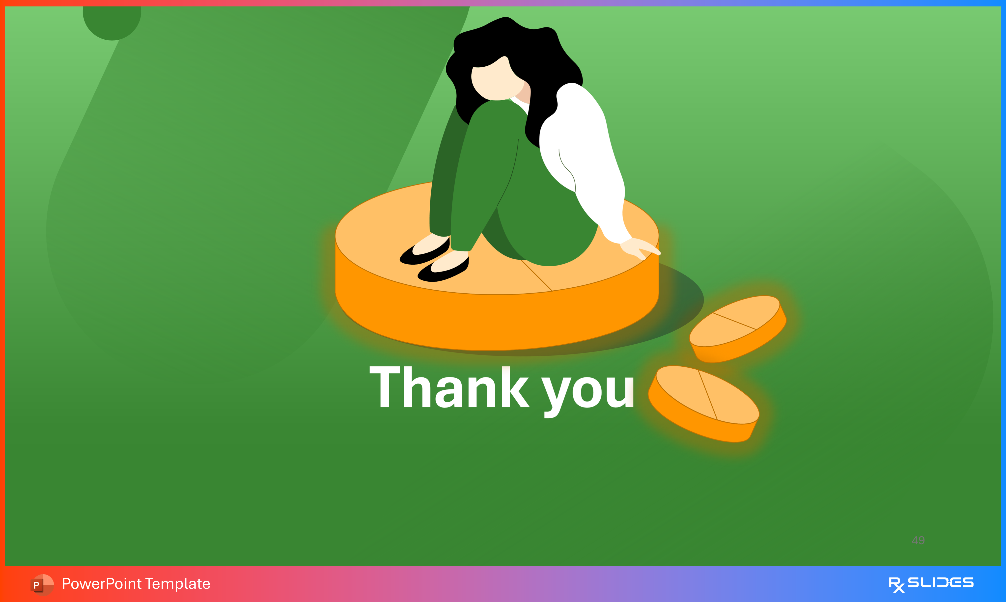 The design utilizes the main visual motif of the presentation the figure sitting on a large pill to provide a strong, thematic closing image.
