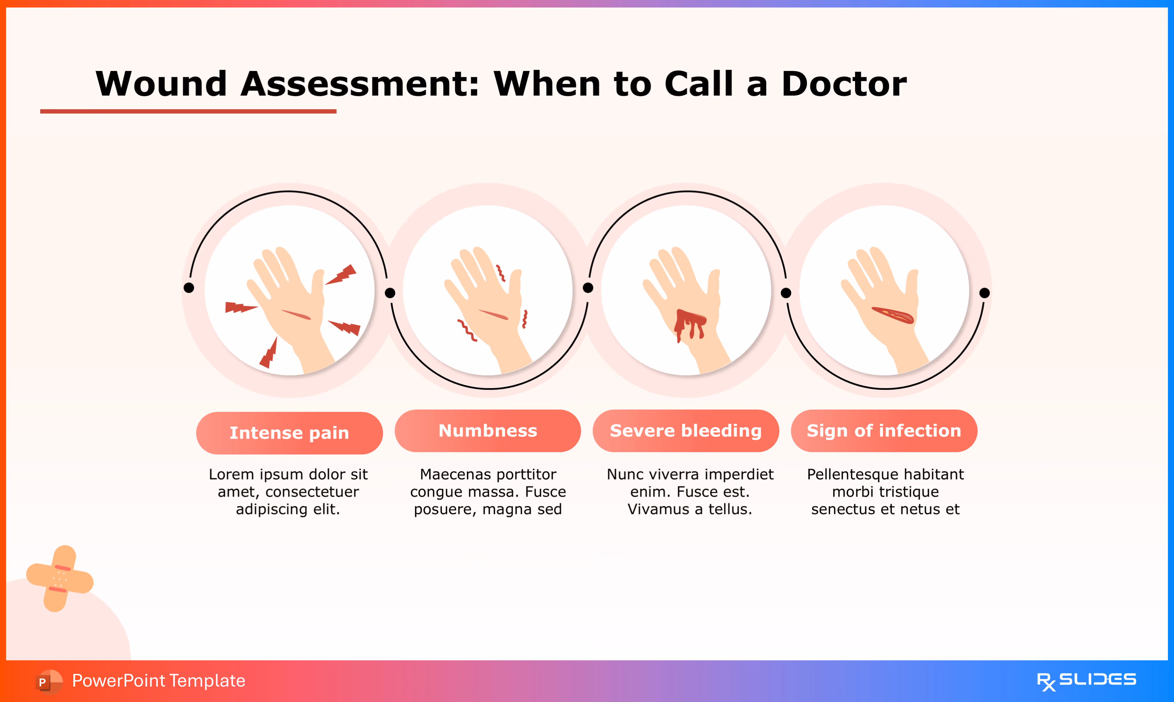 The slide features four sequential hand illustrations, each showing a different warning sign (e.g., numbness, signs of infection), which clarifies when professional help is necessary.