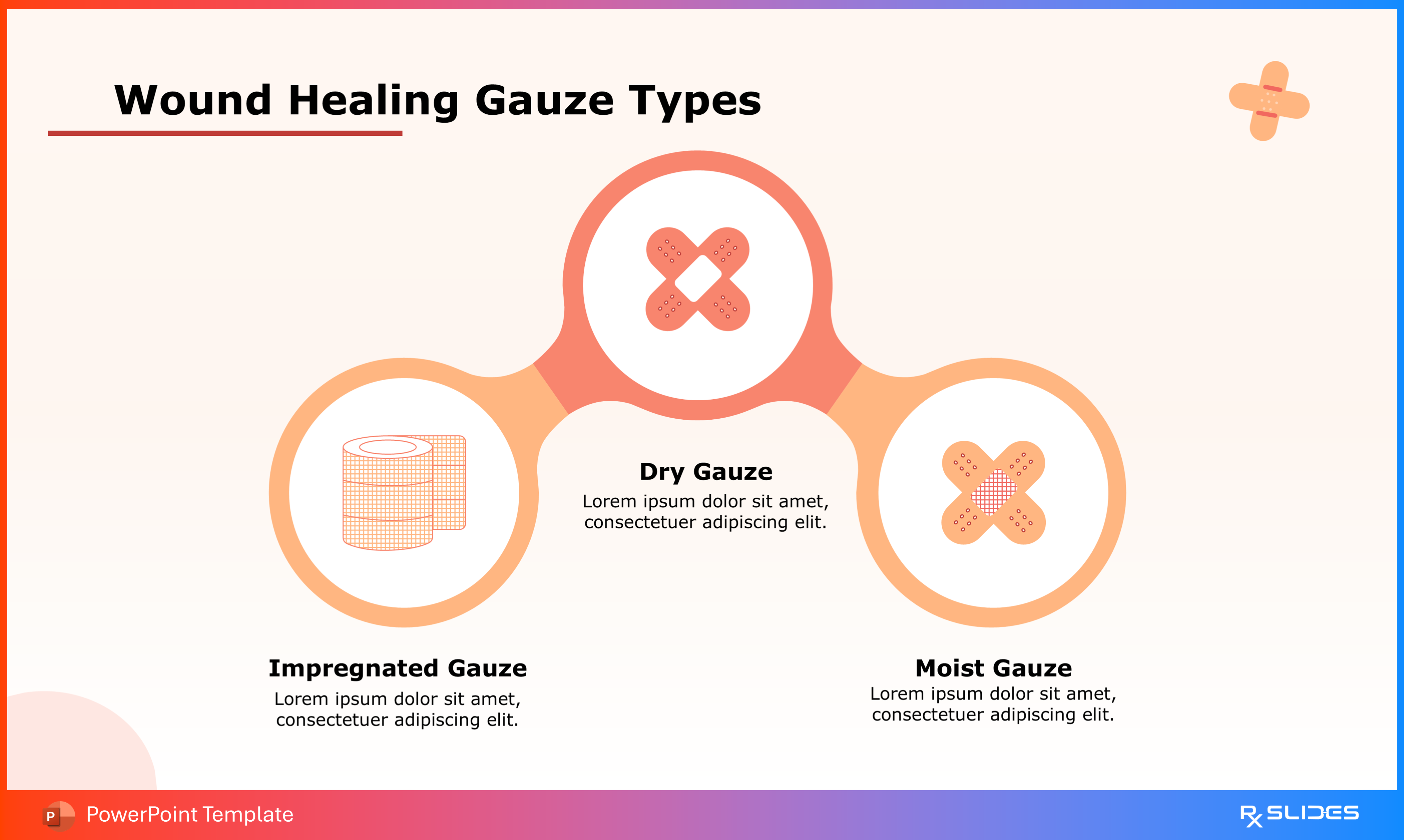 outlines the three essential Gauze Types utilized in wound healing: Dry Gauze, Impregnated Gauze, and Moist Gauze.
