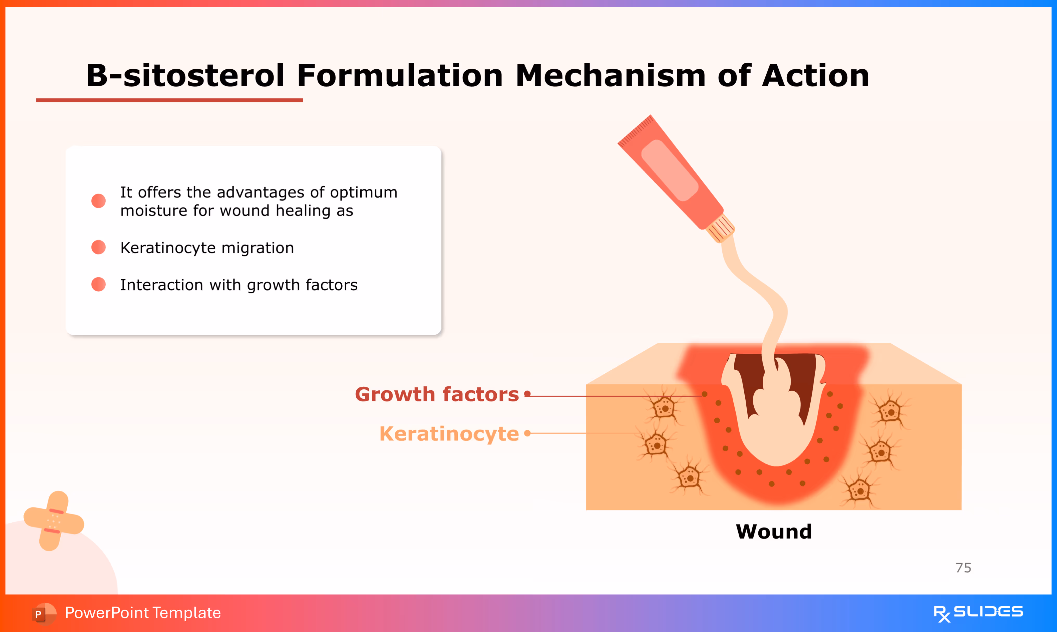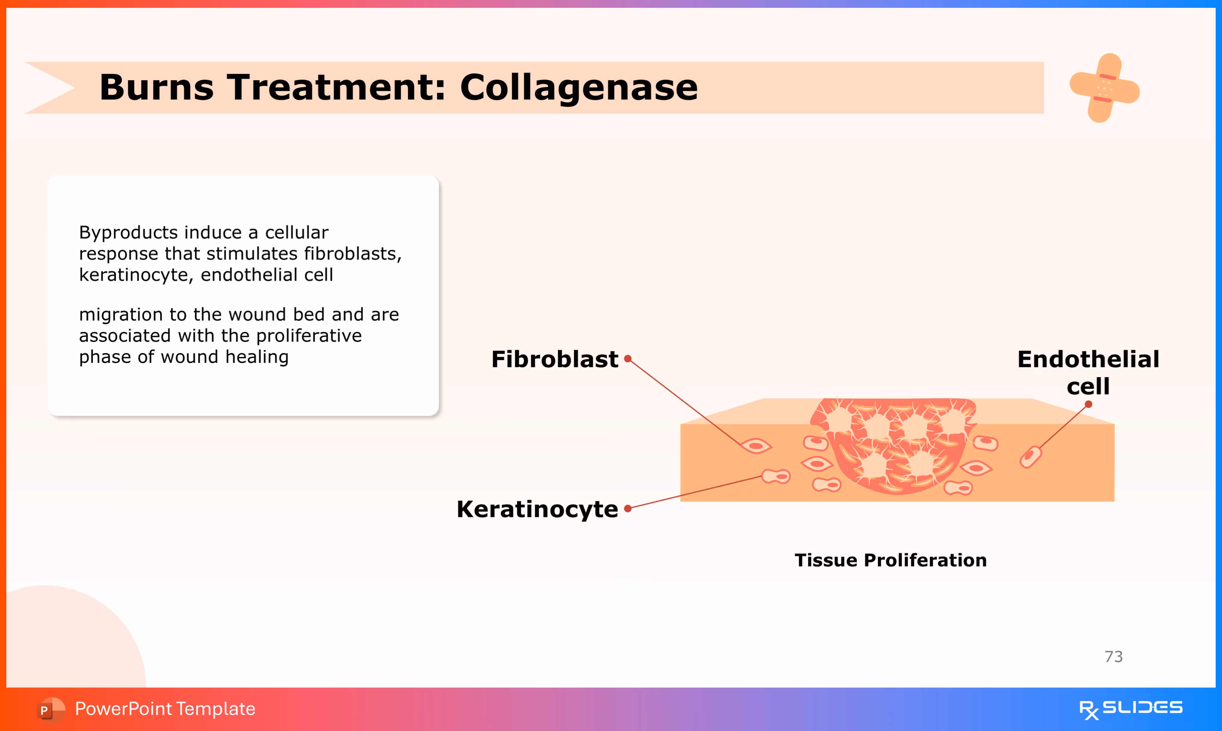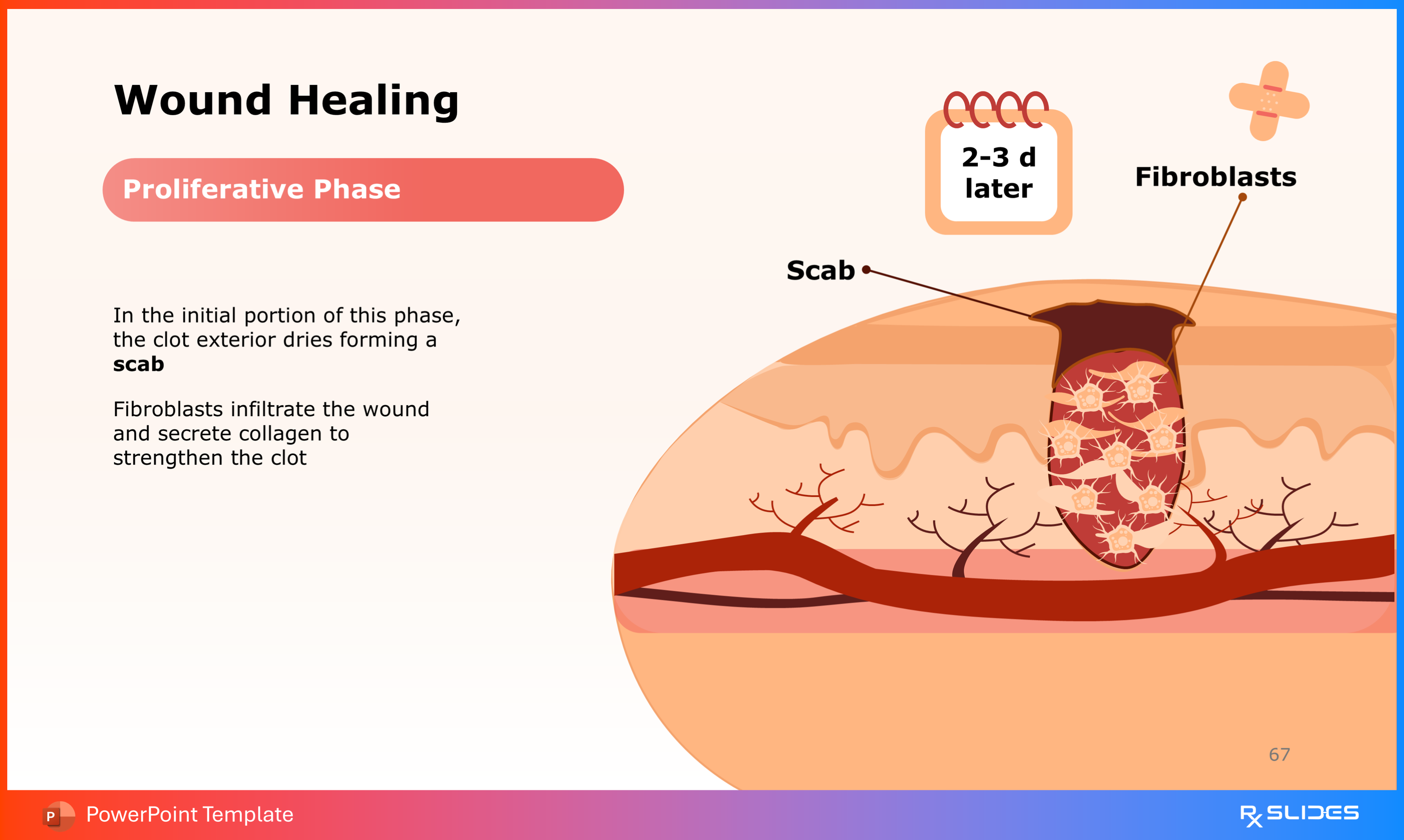 The slide features a prominent illustration of a wound with visible granulation tissue and cellular activity (red dots).