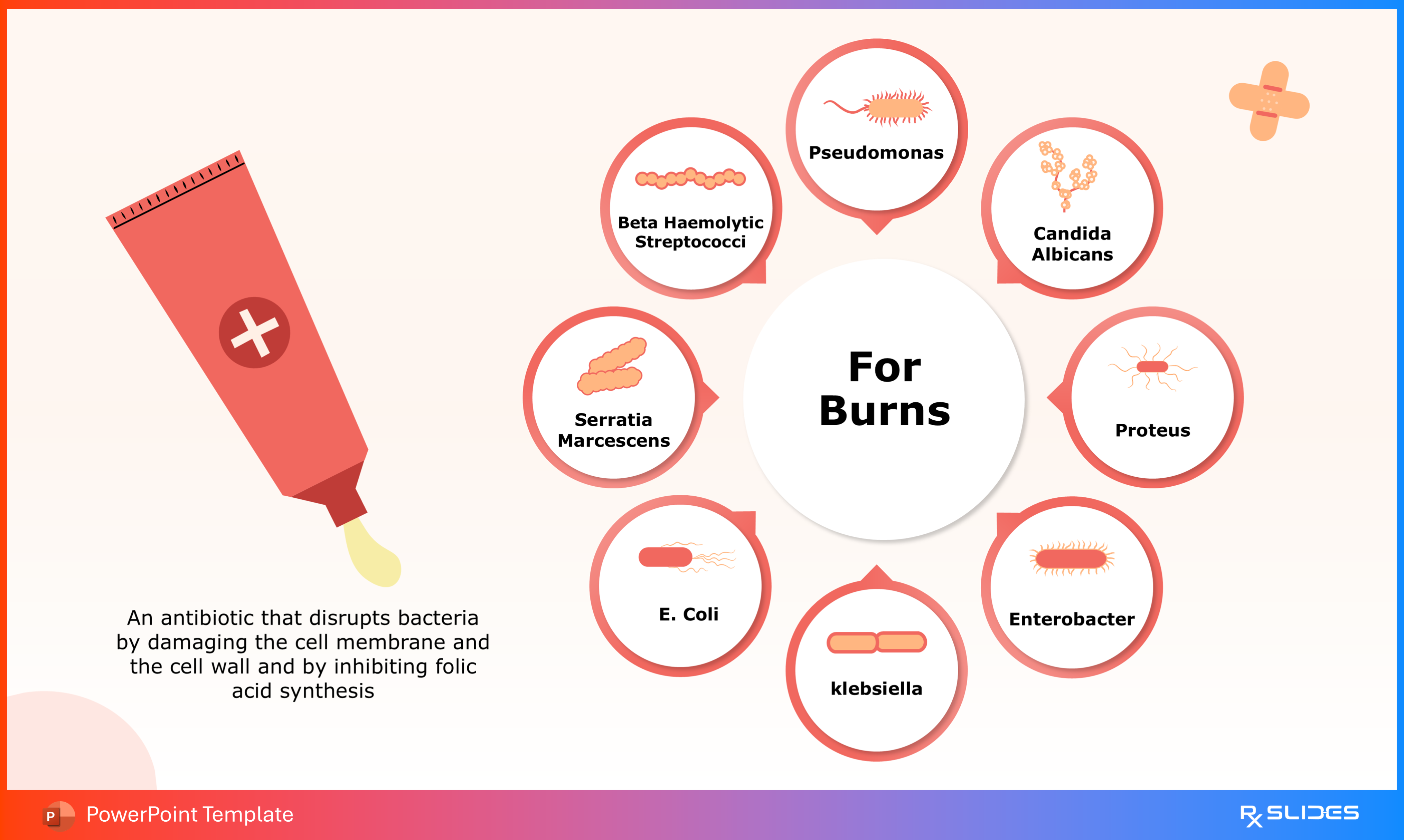 The key feature is the central illustration of the ointment tube surrounded by the various microbes it targets, including Pseudomonas, Candida Albicans, Proteus, Enterobacter, Klebsiella, E. Coli, Serratia Marcescens, and Beta Haemolytic Streptococci.