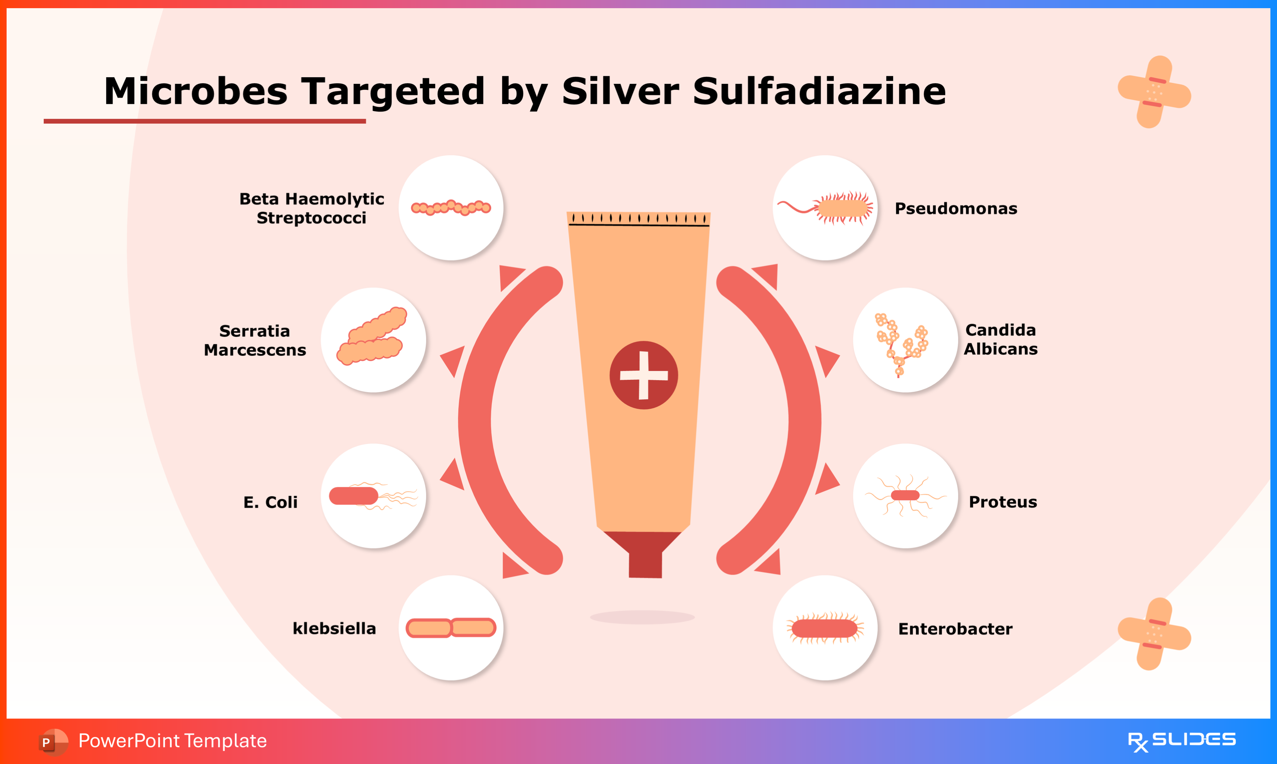 The circular chart confirms that Silver Sulfadiazine targets many of the major microbial threats in burn wounds, including Pseudomonas, Candida Albicans, Proteus, Enterobacter, Klebsiella, E. Coli, Serratia Marcescens, and Beta Haemolytic Streptococci.